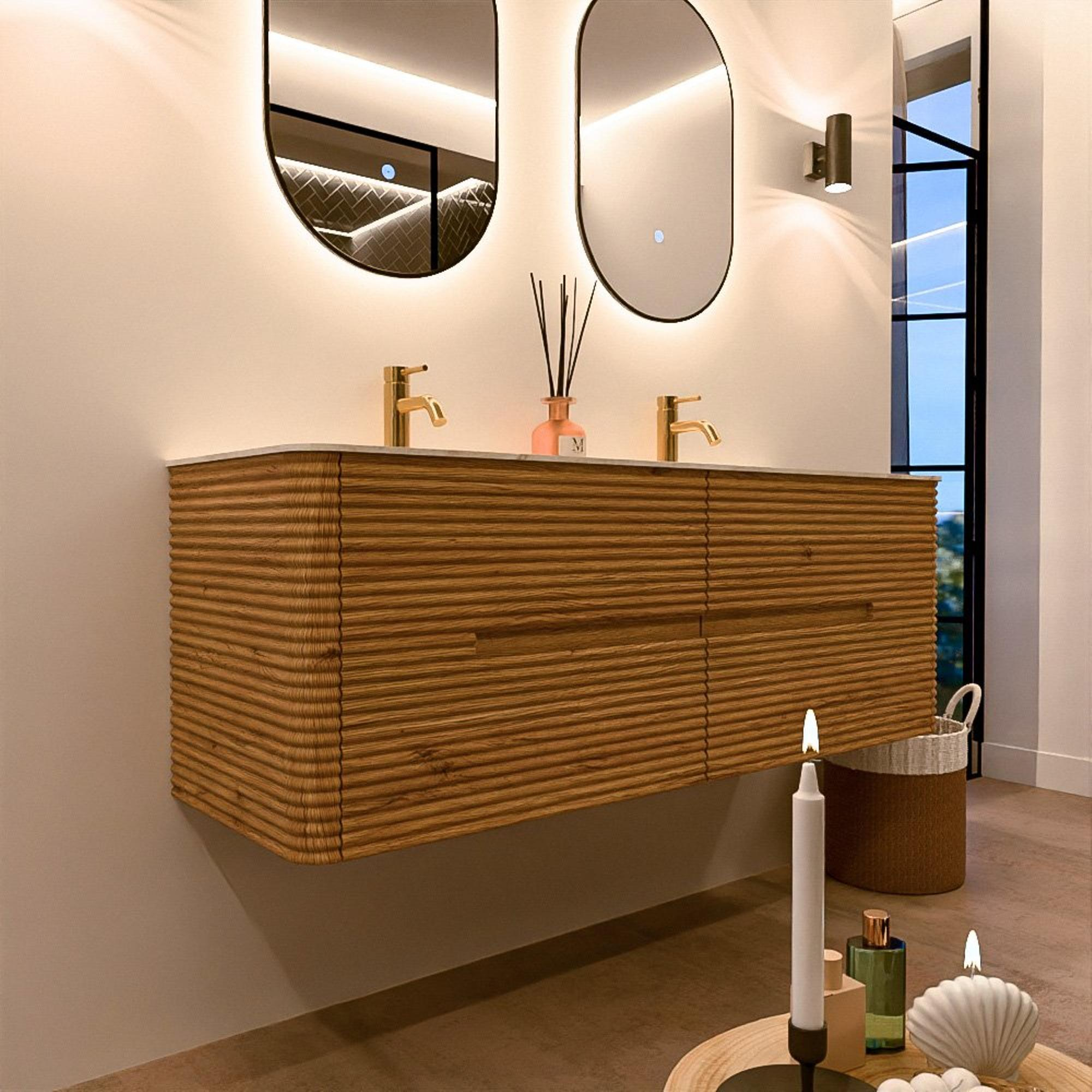 Mondiaz CIRO-DLUX Ensemble de meubles de salle de bains - 140x45x50cm - lavabo solid surface Ostra - 2 vasques double - 2 trous de robinet - 4 tiroirs - Chêne