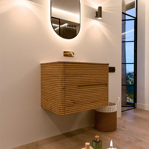 Mondiaz CIRO-DLUX Ensemble meuble de salle de bains - 70x45x50cm - Plan-vasque solid surface Arena - 1 vasque au milieu - sans trous de robinetterie - 2 tiroirs - Chêne