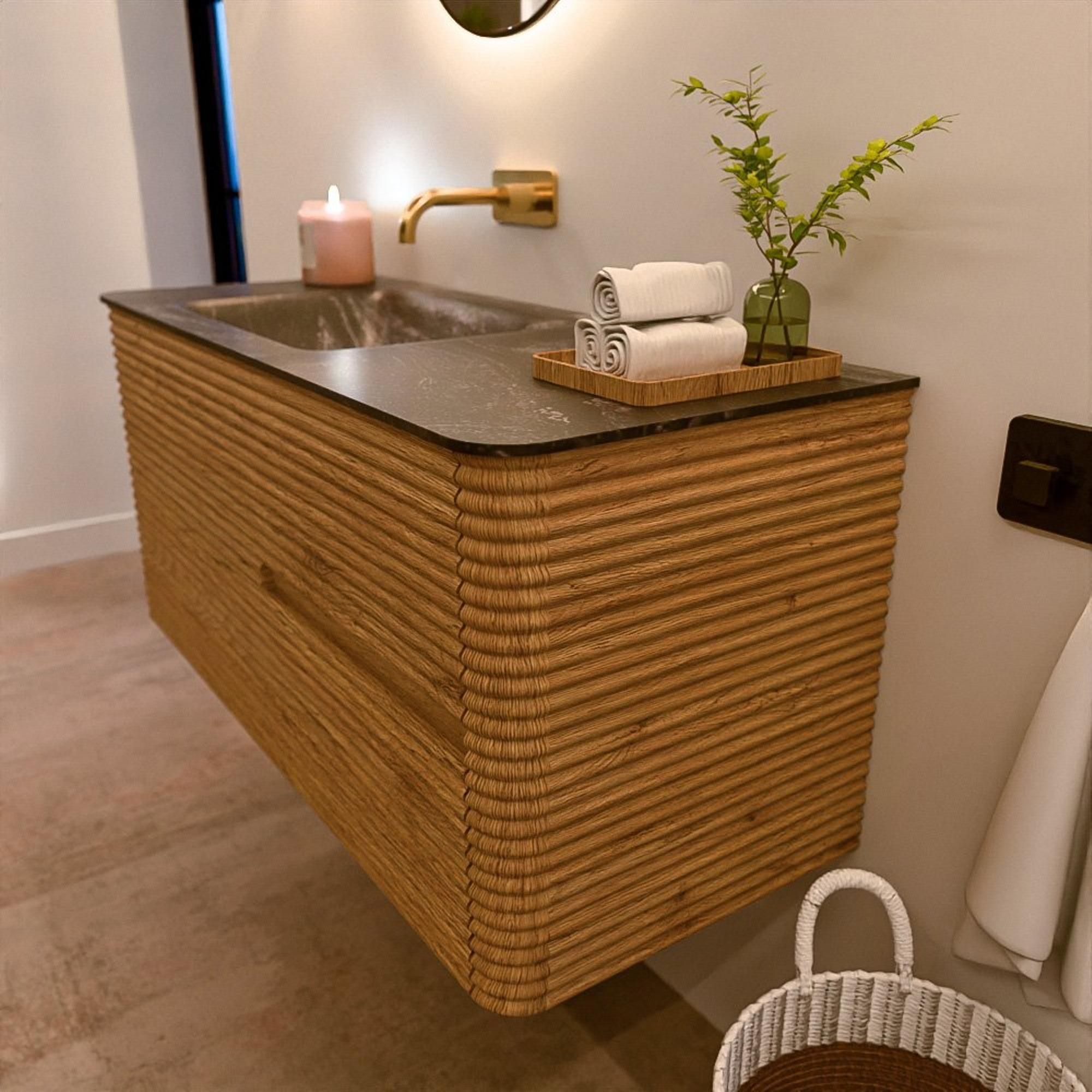 Mondiaz CIRO-DLUX Ensemble de meubles de salle de bains - 110x45x50cm - Plan vasque solid surface Lava - 1 vasque à gauche - sans trous de robinetterie - 2 tiroirs - Chêne