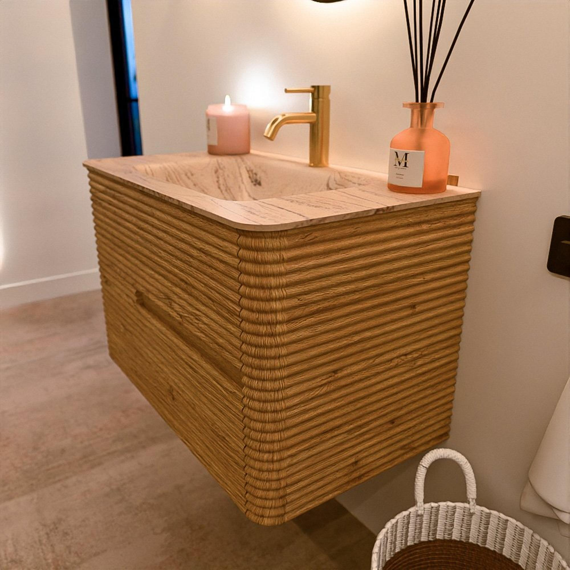 Mondiaz CIRO-DLUX Meuble de salle de bains - 80x45x50cm - Plan vasque solid surface Arena - 1 vasque centrale - 1 trou de robinet - 2 tiroirs - Chêne
