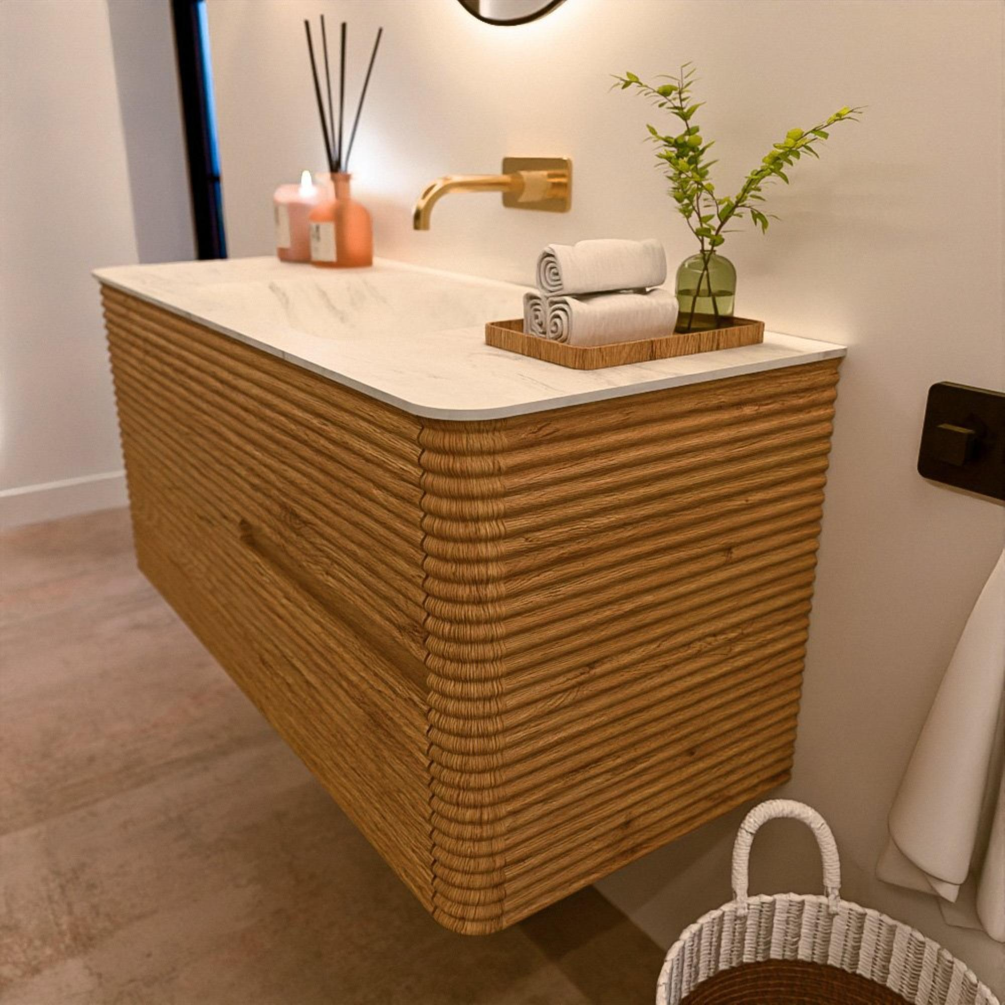 Mondiaz CIRO-DLUX Meuble de salle de bains - 110x45x50cm - vasque en solid surface Opalo - 1 bassin central - sans trous de robinet - 2 tiroirs - Chêne