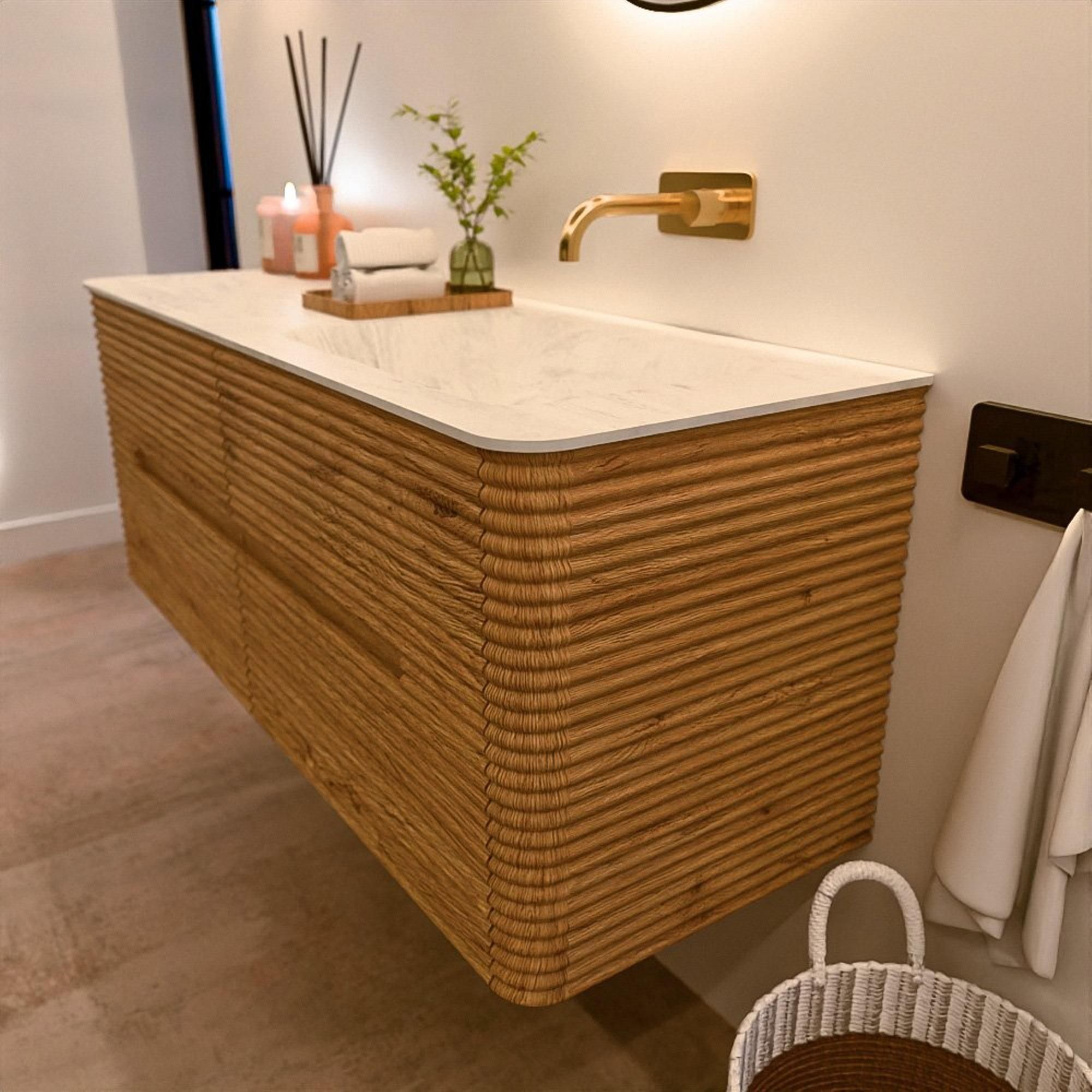Mondiaz CIRO-DLUX Ensemble de meubles de salle de bains - 130x45x50cm - Plan vasque Solid surface Opalo - 1 lavabo à droite - sans trous de robinetterie - 4 tiroirs - Chêne