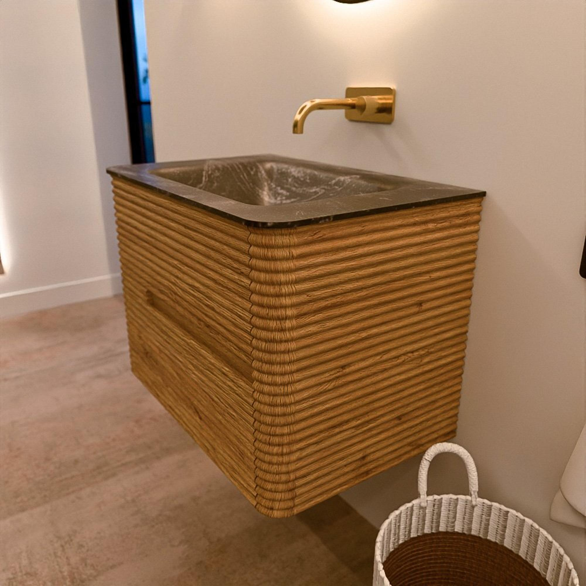 Mondiaz CIRO-DLUX Meuble de salle de bains - 70x45x50cm - lavabo solid surface Lava - 1 vasque au milieu - sans trous de robinet - 2 tiroirs - Chêne