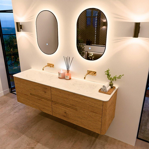 Mondiaz CIRO-DLUX Meuble de salle de bains - 170x45x50cm - plan-vasque solid surface Opalo - 2 bacs Double - sans perçage pour robinetterie - 4 tiroirs - Chêne