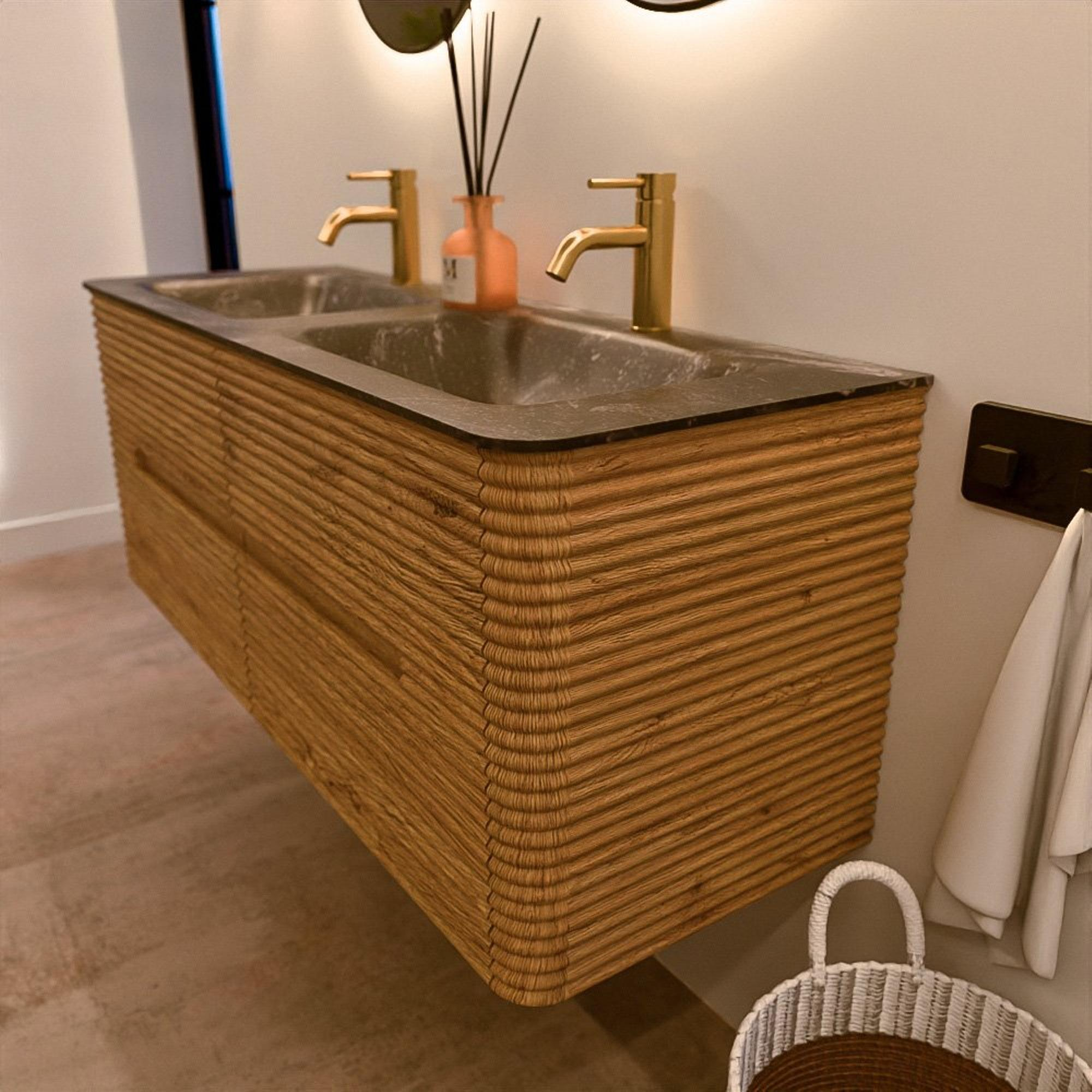 Mondiaz CIRO-DLUX Meuble de salle de bains - 130x45x50cm - Lavabo solid surface Lava - 2 vasques Double - 2 trous de robinet - 4 tiroirs - Chêne