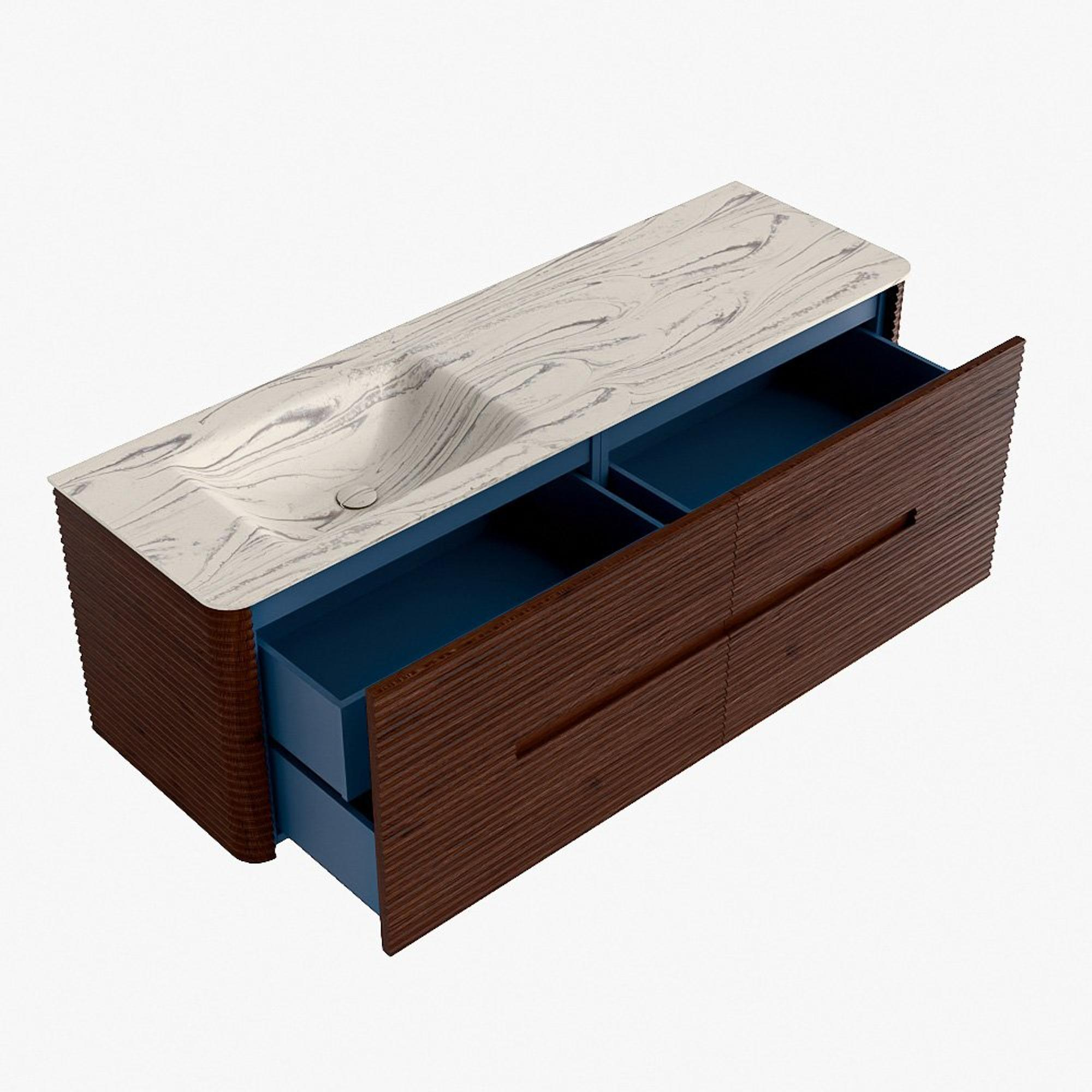 La praticité est un élément essentiel de la gamme CIRO. Le meuble dispose d’un grand tiroir avec un tiroir intérieur supplémentaire, idéal pour ranger de manière organisée tous les articles quotidiens de la salle de bain. Grâce à la poignée intégrée et au mécanisme de fermeture douce, la façade reste sobre, élégante et épurée.