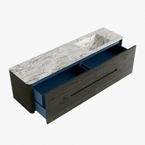 La praticité est un élément essentiel de la gamme CIRO. Le meuble dispose d’un grand tiroir avec un tiroir intérieur supplémentaire, idéal pour ranger de manière organisée tous les articles quotidiens de la salle de bain. Grâce à la poignée intégrée et au mécanisme de fermeture douce, la façade reste sobre, élégante et épurée.