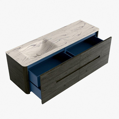 La praticité est un élément essentiel de la gamme CIRO. Le meuble dispose d’un grand tiroir avec un tiroir intérieur supplémentaire, idéal pour ranger de manière organisée tous les articles quotidiens de la salle de bain. Grâce à la poignée intégrée et au mécanisme de fermeture douce, la façade reste sobre, élégante et épurée.