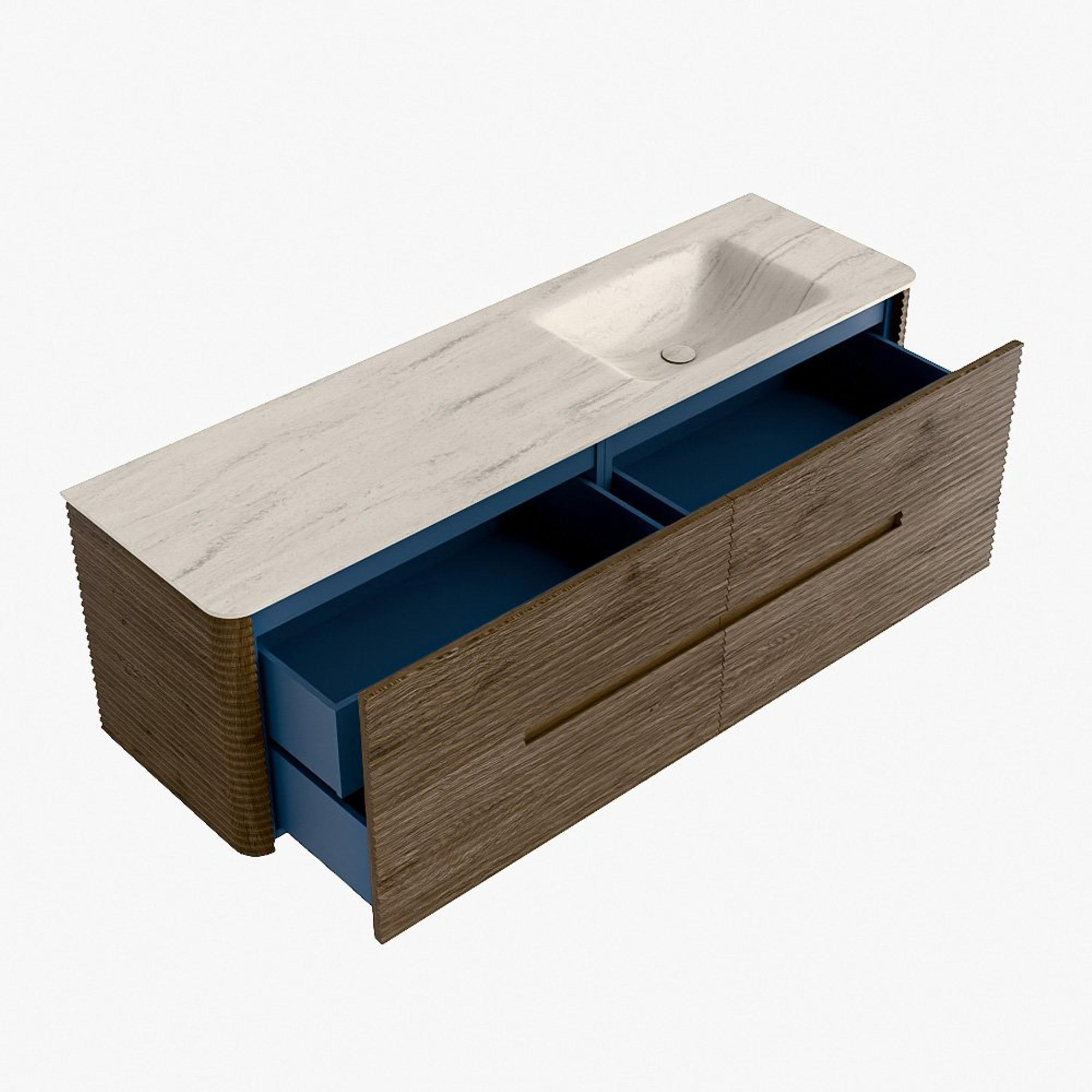 La praticité est un élément essentiel de la gamme CIRO. Le meuble dispose d’un grand tiroir avec un tiroir intérieur supplémentaire, idéal pour ranger de manière organisée tous les articles quotidiens de la salle de bain. Grâce à la poignée intégrée et au mécanisme de fermeture douce, la façade reste sobre, élégante et épurée.