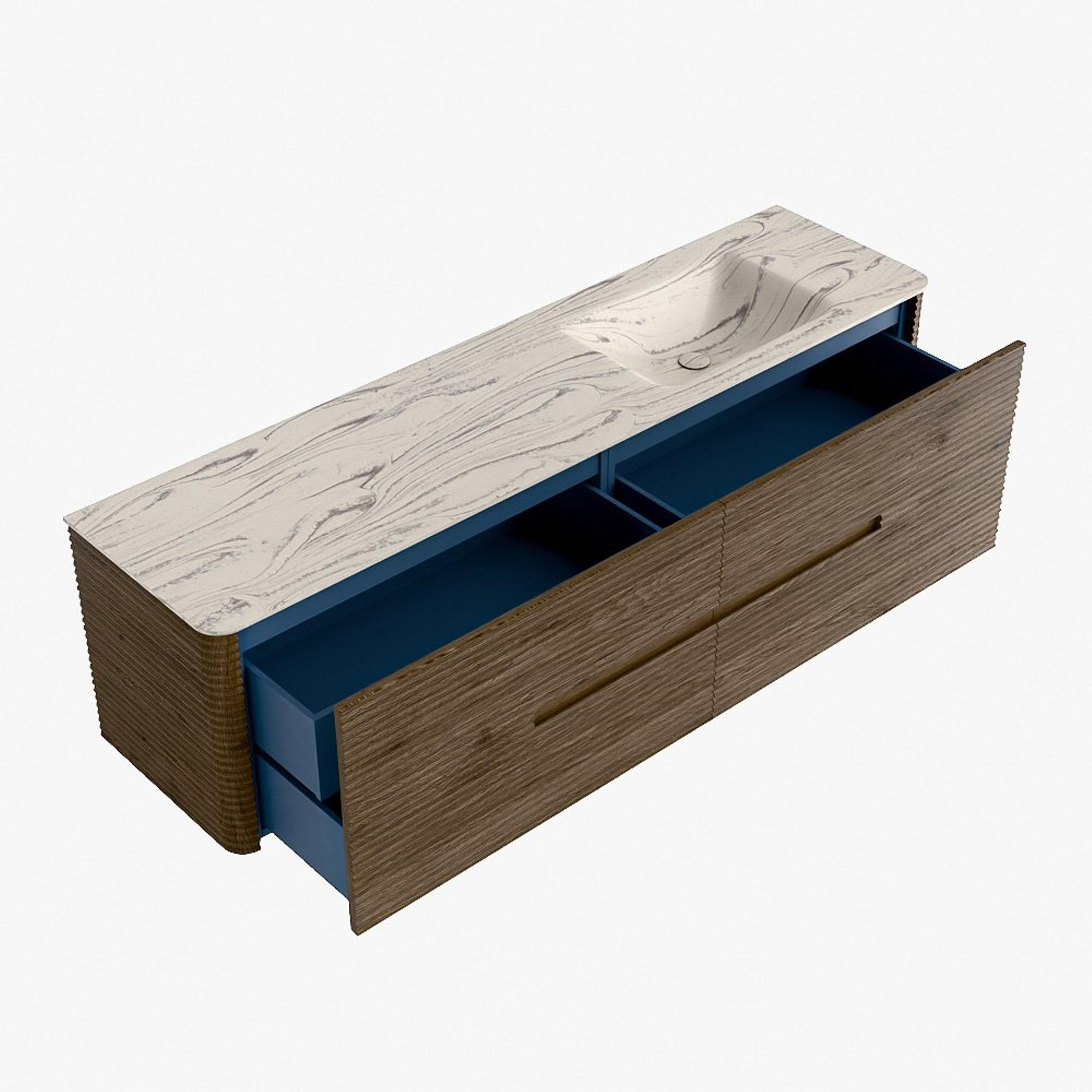 La praticité est un élément essentiel de la gamme CIRO. Le meuble dispose d’un grand tiroir avec un tiroir intérieur supplémentaire, idéal pour ranger de manière organisée tous les articles quotidiens de la salle de bain. Grâce à la poignée intégrée et au mécanisme de fermeture douce, la façade reste sobre, élégante et épurée.