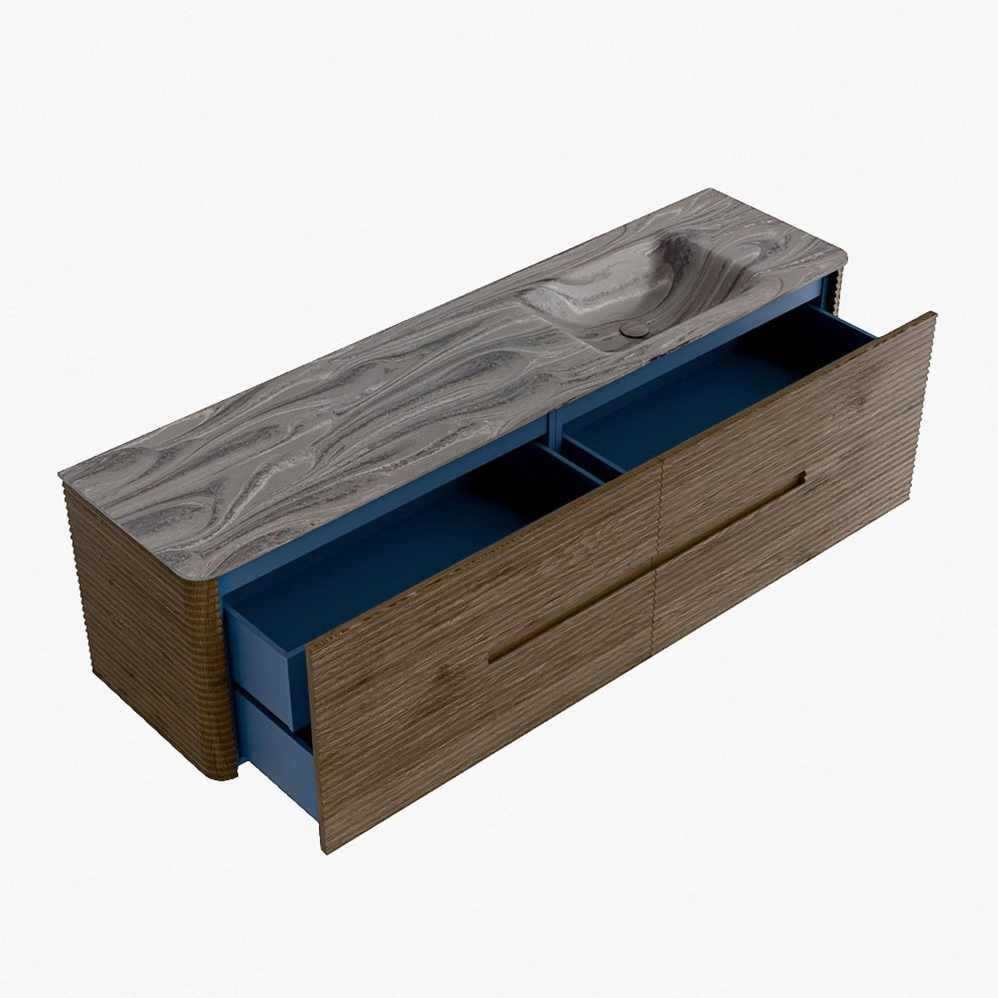 La praticité est un élément essentiel de la gamme CIRO. Le meuble dispose d’un grand tiroir avec un tiroir intérieur supplémentaire, idéal pour ranger de manière organisée tous les articles quotidiens de la salle de bain. Grâce à la poignée intégrée et au mécanisme de fermeture douce, la façade reste sobre, élégante et épurée.