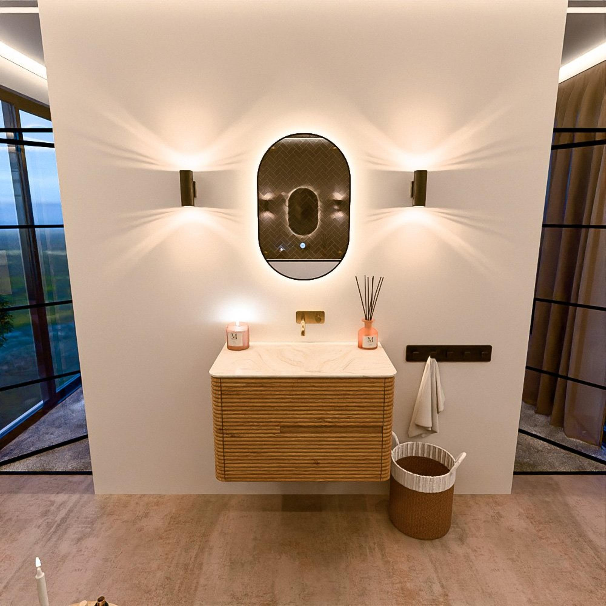 Mondiaz CIRO-DLUX Ensemble meuble de salle de bains - 80x45x50cm - lavabo solid surface Ostra - 1 vasque au milieu - sans trous de robinet - 2 tiroirs - Chêne