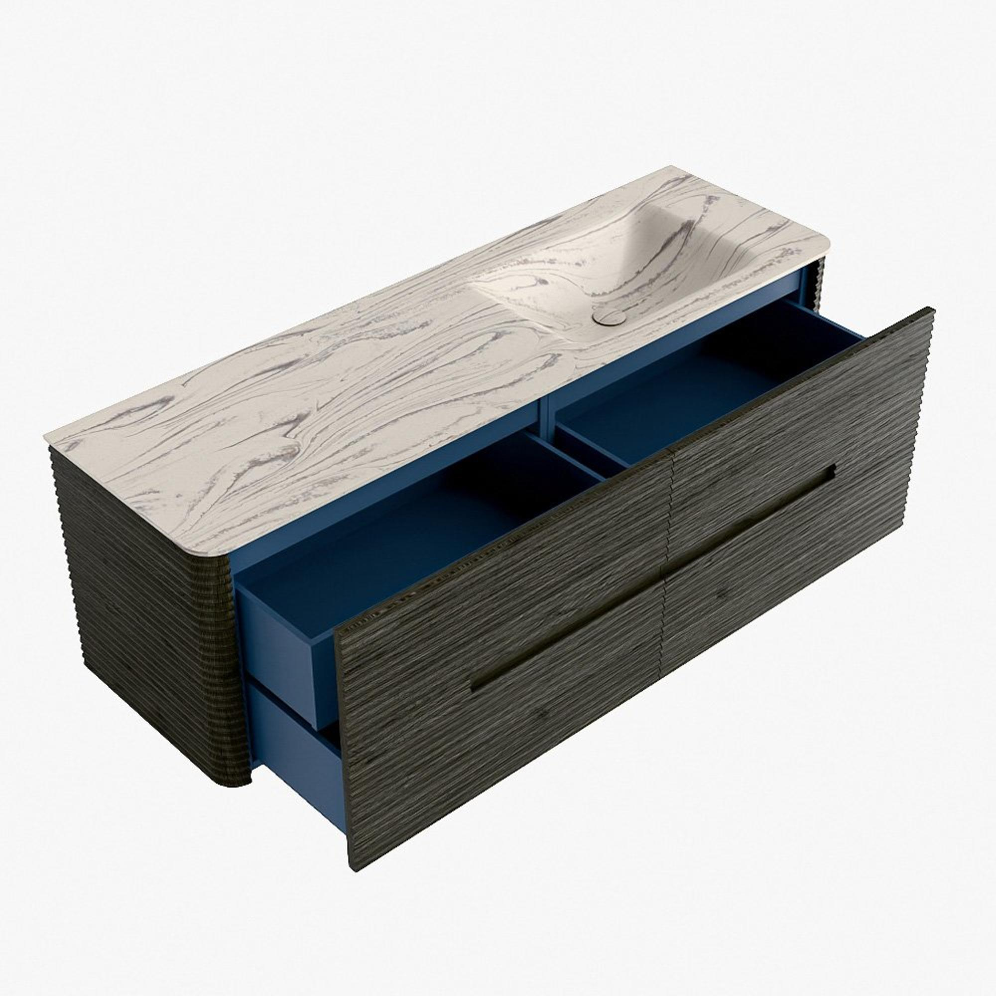 La praticité est un élément essentiel de la gamme CIRO. Le meuble dispose d’un grand tiroir avec un tiroir intérieur supplémentaire, idéal pour ranger de manière organisée tous les articles quotidiens de la salle de bain. Grâce à la poignée intégrée et au mécanisme de fermeture douce, la façade reste sobre, élégante et épurée.