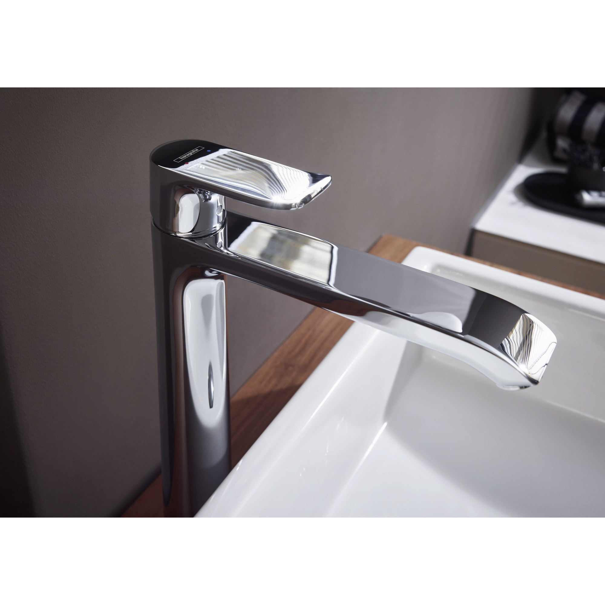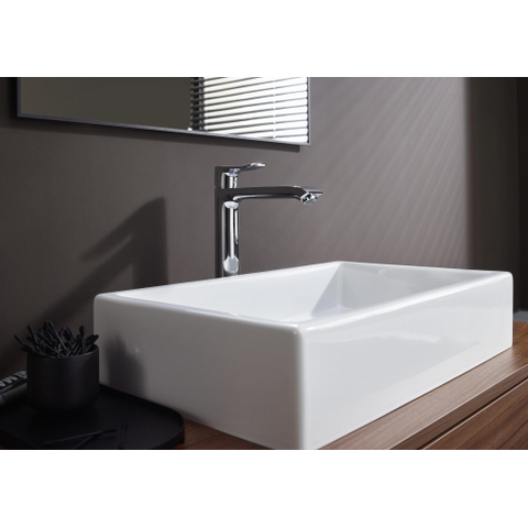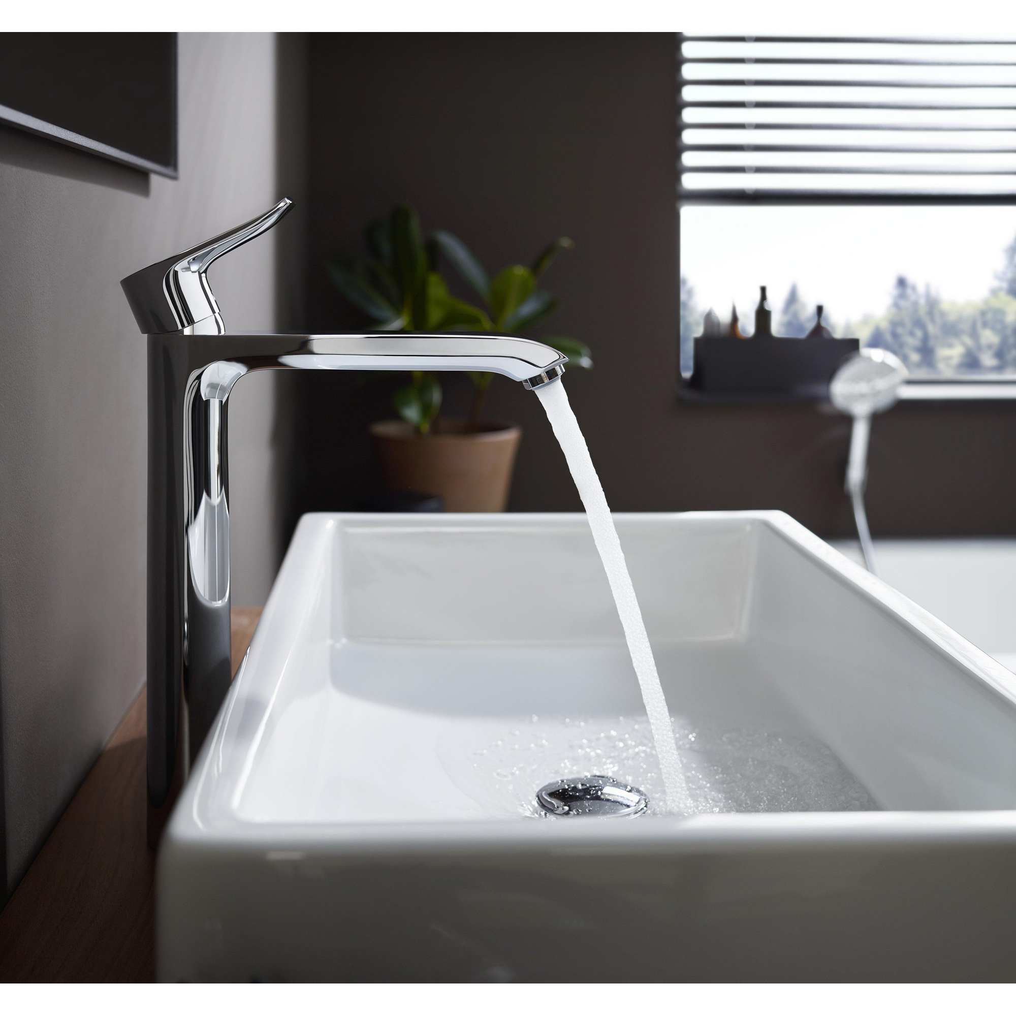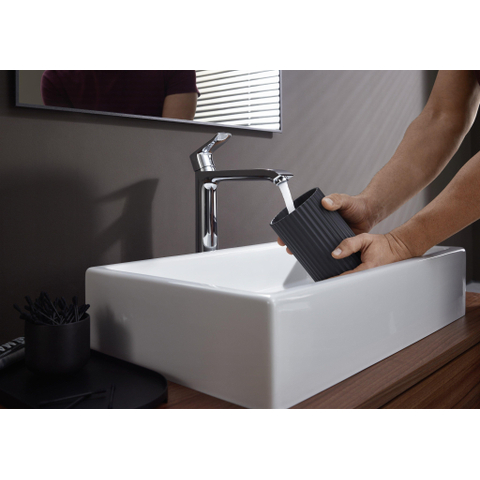 Transformeer je badkamer met een kraan die niet alleen functioneel is, maar ook een stijlvolle blikvanger vormt. Deze hoogwaardige mengkraan biedt je volop bewegingsvrijheid dankzij de extra hoge uitloop, ideaal voor grotere waskommen en het wassen van je haar. Het strakke, tijdloze design met een glanzende chromen afwerking voegt een moderne en frisse uitstraling toe aan je wastafel. Dankzij de slimme technologieën geniet je van een comfortabele bediening en een duurzaam waterverbruik, waardoor je niet alleen je badkamer verfraait, maar ook bijdraagt aan een milieuvriendelijke levensstijl. Met deze kraan maak je van je wastafel een plek waar gemak en elegantie samenkomen, zodat je elke dag opnieuw plezier beleeft aan je badkamer.