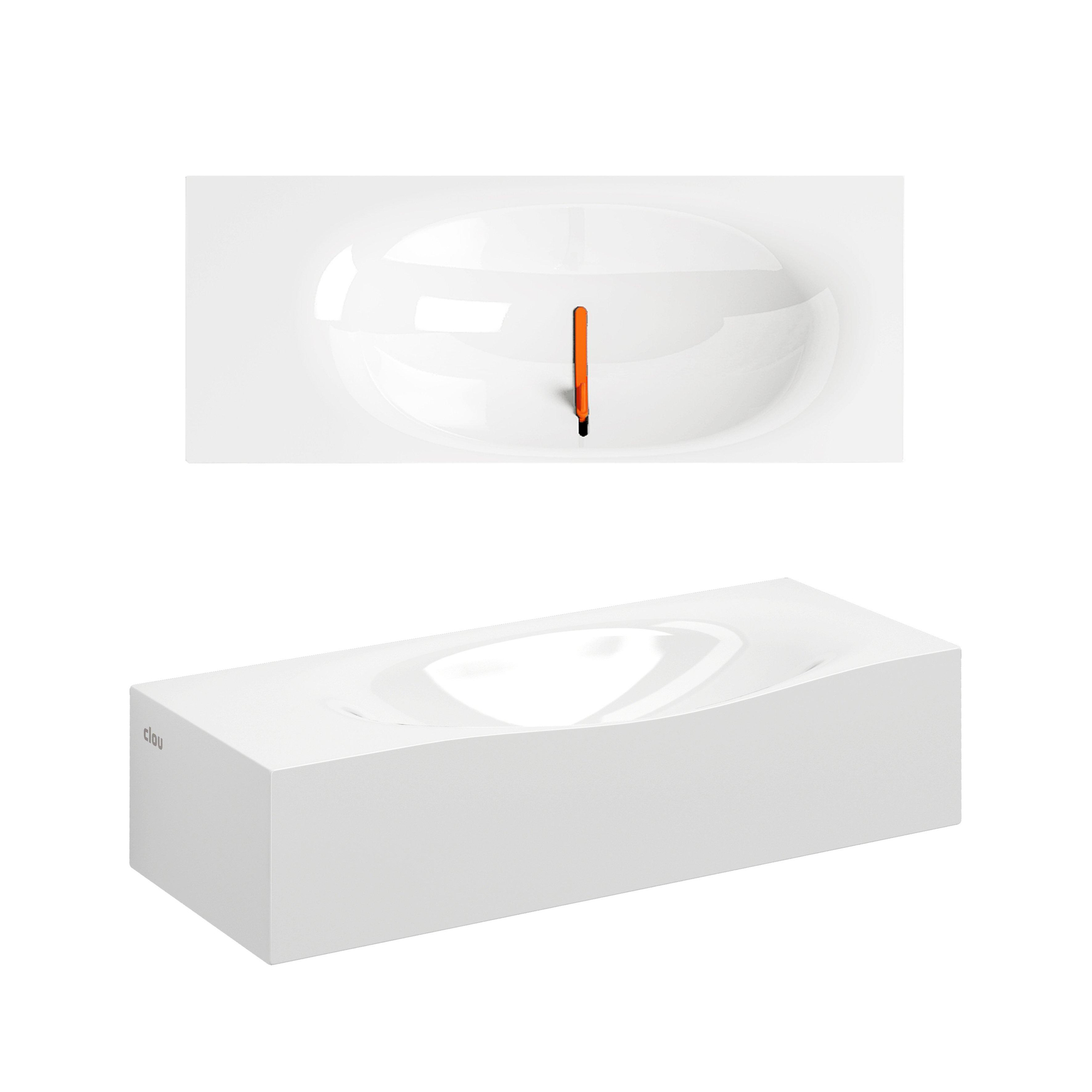 Uniek DesignDe waskom is voorzien van een langwerpige opening in de vorm van een snede. Deze opening is een combinatie van afvoer en overloop in één. De silicone afvoerplug sluit de langwerpige opening van de waskom af waardoor bovenaan een overloop ontstaat. De afvoeropening is berekend op een snelle afvoer van het water in de waskom Het wastafelblad is naadloos verbonden met de zeer vloeiend gevormde waskom. Hierdoor zijn het wastafelblad en waskom heel gemakkelijk schoon te houden. Vooral met een wandgemonteerde kraan is het oppervlak geheel naadloos. De waskom wordt geleverd inclusief een speciaal ontworpen reiniging set. Dit alles verpakt in een aantrekkelijk vormgegeven doosje.