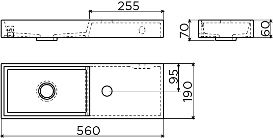 Met een breedte van 56 cm en een diepte van slechts 19 cm benut je de beschikbare ruimte optimaal, ook in een smal toilet of compacte badkamer. Het bassin is zo ontworpen dat het vlak tegen de muur ligt, terwijl je alsnog genoeg ruimte hebt om je handen comfortabel te wassen. Doordat het kraangat aan de rechterkant zit, blijft de kom zelf zo ruim mogelijk en ontstaat er een logische indeling als je de kraan rechts wilt bedienen. Het strakke, rechthoekige design sluit mooi aan bij moderne toiletten en rechte lijnen in je interieur, en geeft zelfs het kleinste kamertje een doordachte, luxe uitstraling.