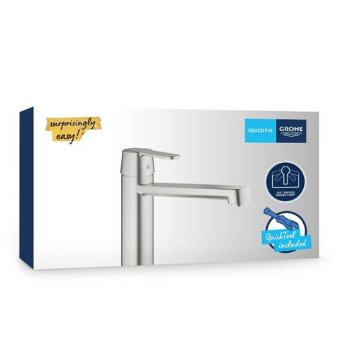 Dankzij het GROHE FastFixation snelmontagesysteem plaats je deze keukenmengkraan zonder gedoe: de heldere opbouw, het meegeleverde QuickTool en de flexibele aansluitslangen maken de installatie ook voor de handige doe-het-zelver goed te doen. De standaard 3/8 inch aansluiting sluit naadloos aan op de meeste keukensituaties. Een instelbare doorstroombegrenzer helpt je om bewuster met water om te gaan, zonder in te leveren op comfort. Doordat dit model onderdeel is van een grotere serie, kun je de stijl eenvoudig doortrekken naar andere kranen in huis voor een rustig, harmonieus geheel. Met 5 jaar garantie op het product weet je dat je kiest voor een technische kwaliteit waar je op kunt bouwen.
