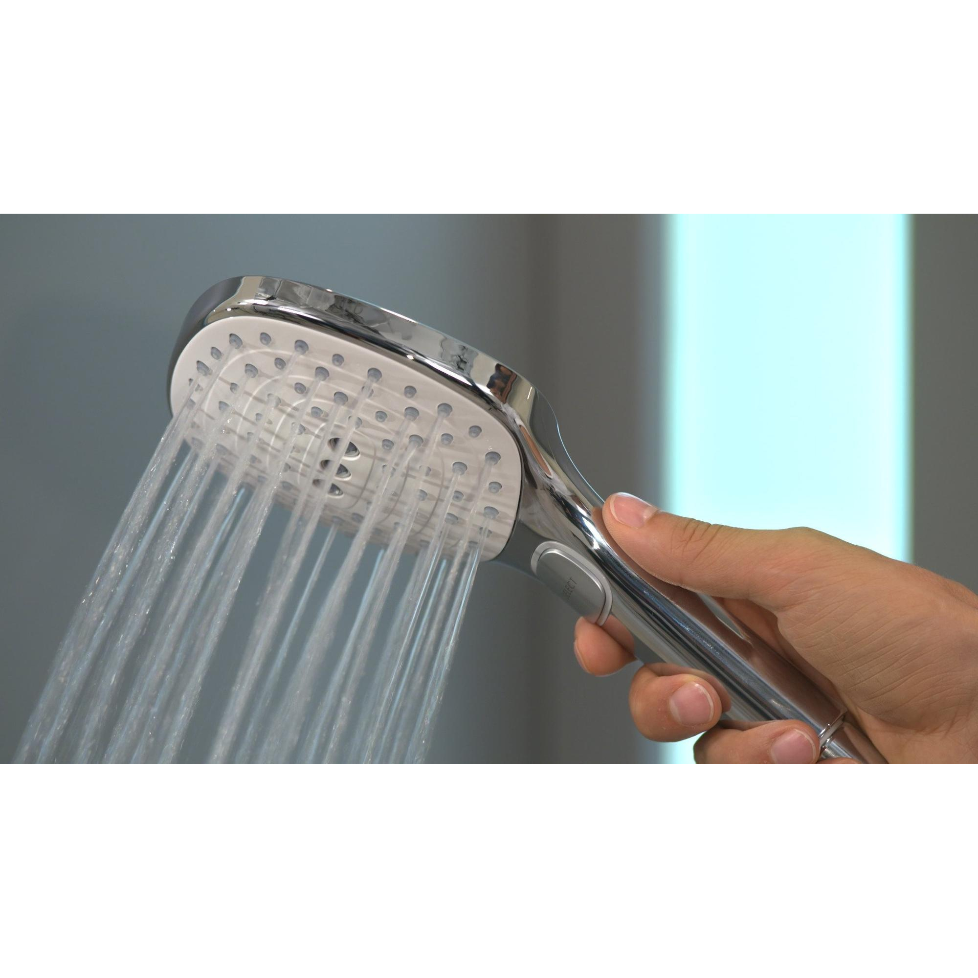 De handdouche biedt drie verschillende straalsoorten: een krachtige regenstraal, een zachte, volle regenstraal en een intensieve massagestraal. Met de handige Select-knop wissel je moeiteloos tussen deze standen, zodat je altijd de perfecte straal kiest die past bij jouw stemming en behoefte. De grote diameter van de douchekop zorgt voor een brede waterstraal die je volledig omhult, terwijl het gebruiksgemak centraal staat. Dit maakt douchen niet alleen comfortabel, maar ook bijzonder plezierig. Dankzij de slimme functies houd je de controle en maak je van elke douche een persoonlijke wellnesservaring.