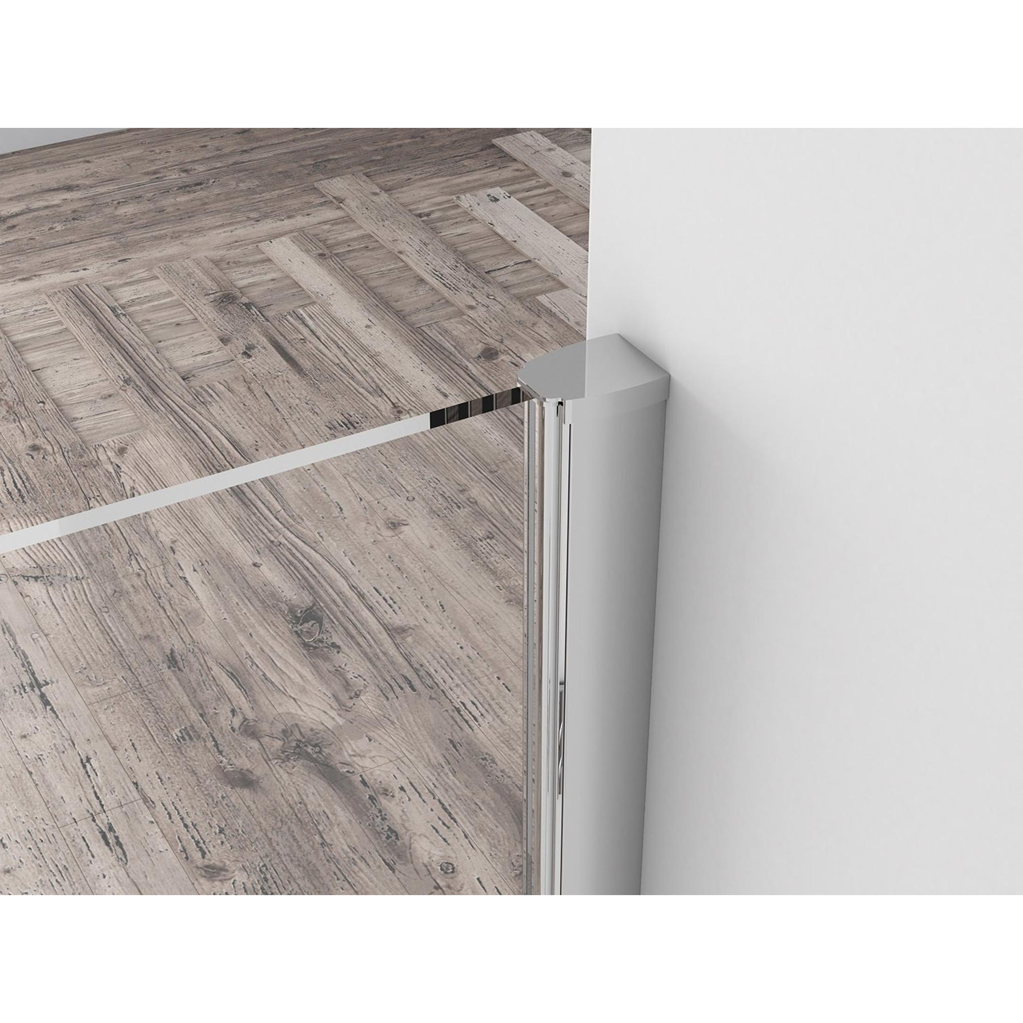 Het heldere glas wordt doorbroken door een subtiele melkglas middenband die ongeveer een derde van het oppervlak beslaat. Dit geeft de douche een eigentijdse uitstraling en biedt tegelijkertijd extra privacy zonder het open gevoel te verliezen. De combinatie van helder en mat glas zorgt voor een speels effect dat licht prachtig verspreidt. Het chroomkleurige zijprofiel en de stabilisatiestang van 100 cm maken het geheel af met een moderne, glanzende touch die naadloos aansluit bij diverse badkamerstijlen.
