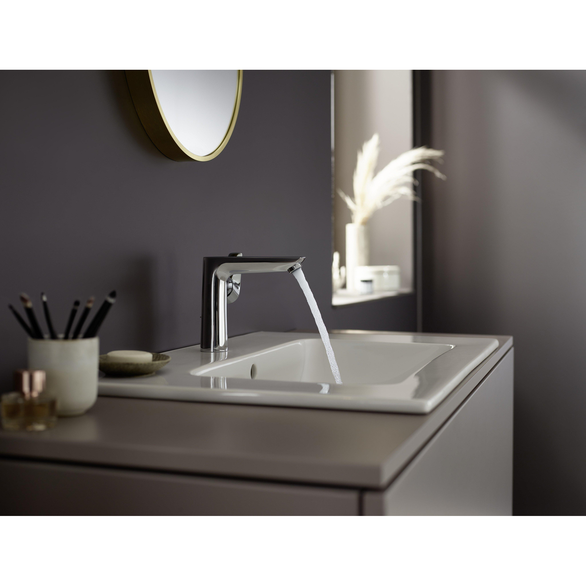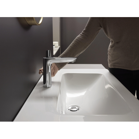 De kraan valt direct op door zijn moderne en tijdloze design. De strakke randen en grote, vlakke oppervlakken geven het geheel een elegante uitstraling die in elke badkamer tot zijn recht komt. Het chroomoppervlak zorgt voor een glanzende finish die niet alleen mooi is, maar ook eenvoudig te onderhouden. Dankzij het QuickClean-systeem veeg je kalk moeiteloos van de siliconen inzetstukken, waardoor de kraan er altijd als nieuw uitziet. Zo geniet je van een stijlvol armatuur dat jarenlang zijn charme behoudt en je badkamer een luxe uitstraling geeft.