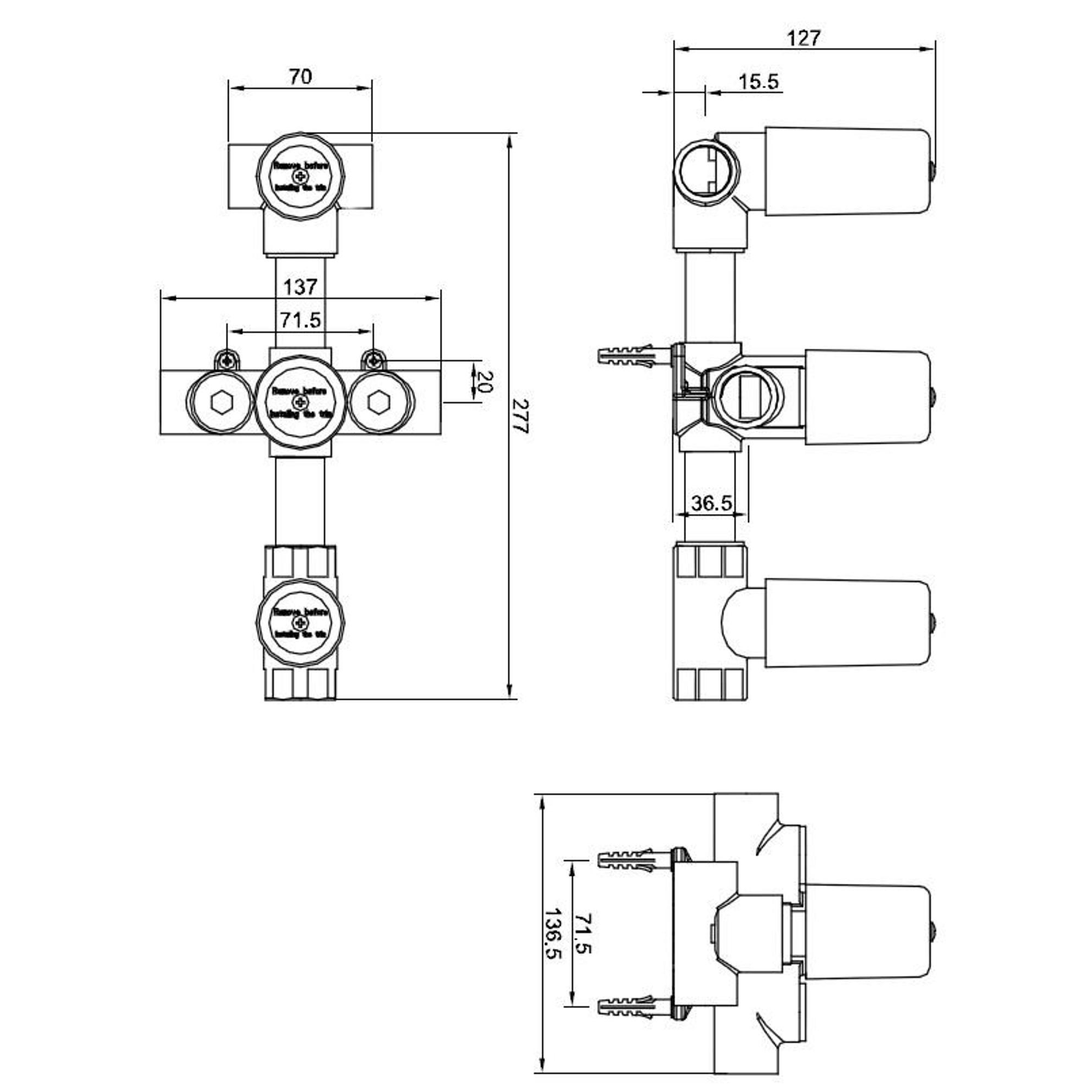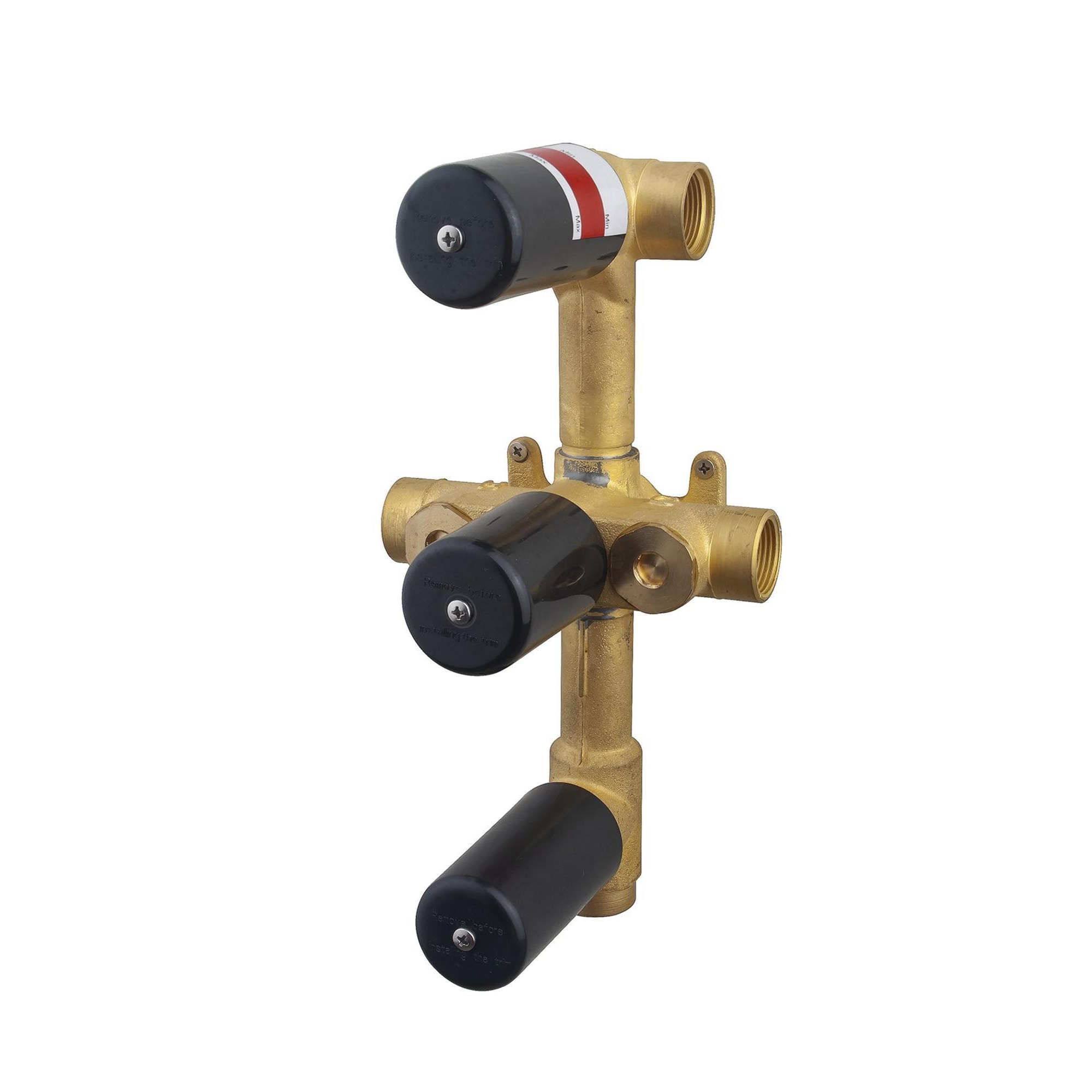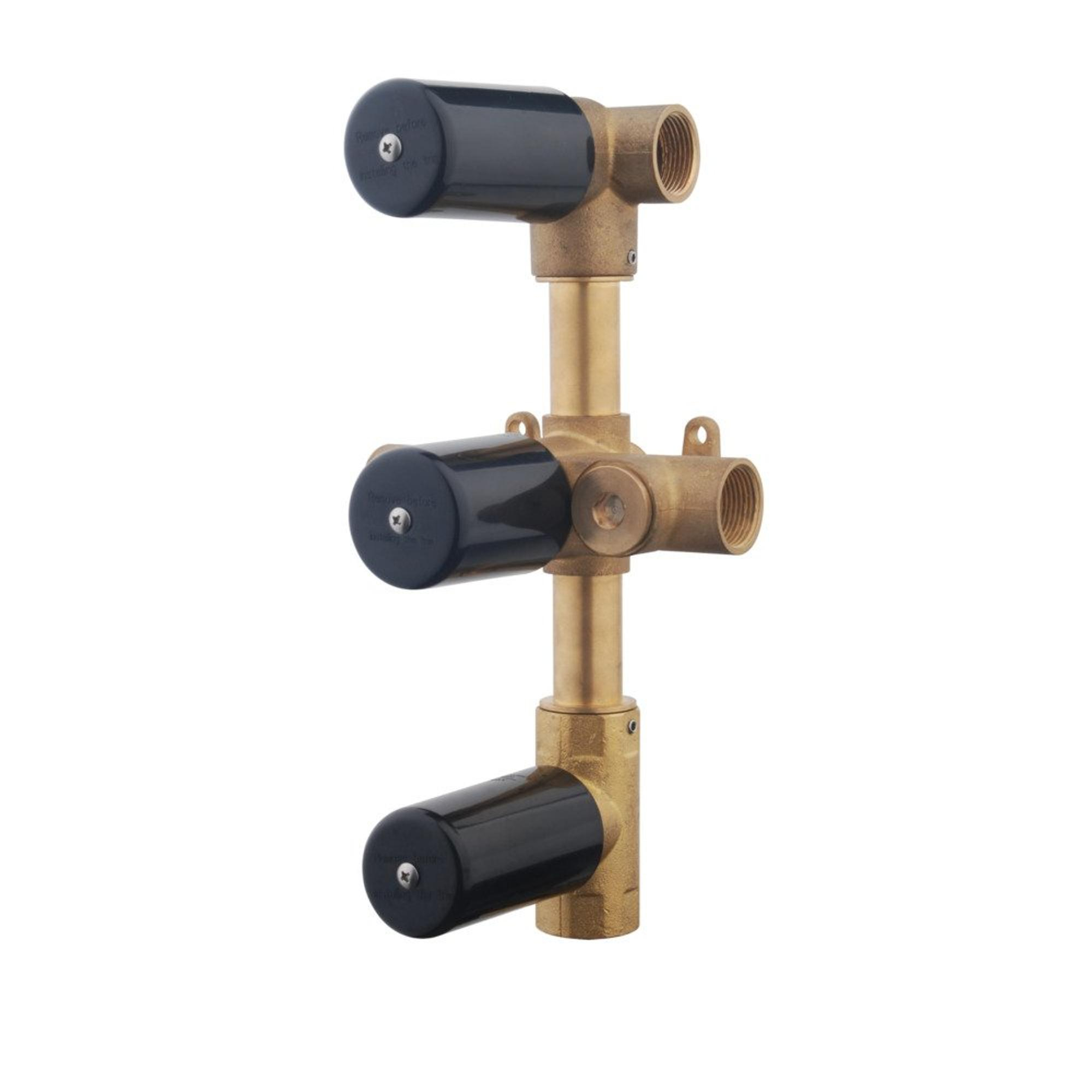 Inbouwkraan thermostatisch zonder afbouwset. 3/4" binnendraad aansluitingen, keramische omstelknop(pen), Easy-Clean filters- en terugslagkleppen. Deze zijn eenvoudig te verwijderen en terug te plaatsen wanneer de kraan in de muur zit. Blokkering op 38 graden. Geschikt voor de Caral, Rombo of Cross afbouwset...(apart te bestellen)