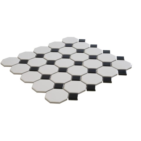 Met zijn achthoekige vorm en verfijnde kleurencombinatie straalt de Mosaic Factory Paris mozaïektegel een onmiskenbare elegantie uit. Of het nu op de vloer of aan de wand wordt geplaatst, deze tegel voegt een vleugje luxe toe aan elke ruimte. De subtiele glans van de zwarte tegels geeft de tegel een chique uitstraling die de ruimte een gevoel van verfijning geeft.