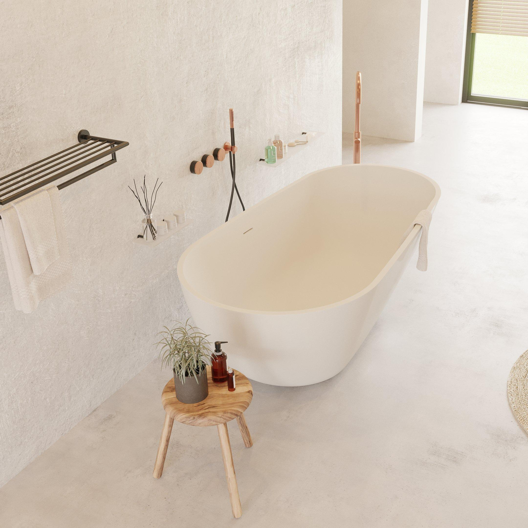 Met dit royale vrijstaande ligbad haal je een echte blikvanger in huis die je badkamer in één keer een luxe wellness-uitstraling geeft. De royale afmetingen maken het bad ideaal voor wie graag lang en comfortabel wil ontspannen, alleen of met z’n tweeën. Dankzij de ovale, eivormige kuip en de matte witte kleur past het perfect in moderne en minimalistische badkamers, maar ook in een meer warme, hotel-chique stijl komt het prachtig tot zijn recht. Het naadloze solid surface materiaal voelt zacht en aangenaam aan op de huid en houdt het water langer op temperatuur, wat fijn is als je graag uitgebreid baddert. Door de vrijstaande plaatsing heb je veel vrijheid in het ontwerp van je ruimte: midden in de badkamer als echte eyecatcher, of juist tegen een wand met een mooie eilandkraan erbij. Dit is een slimme keuze als je gaat voor design, comfort en duurzaamheid in één.