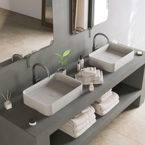Met deze compacte, strakke opbouwwastafel creëer je in één keer een rustige en luxe uitstraling in de badkamer of het toilet. Dankzij het rechthoekige ontwerp met slanke randen past dit model prachtig op een badmeubelblad of maatwerkblad en is het ideaal voor zowel moderne familiebadkamers als stijlvolle guest bathrooms. De matte, fluweelachtige toplaag oogt niet alleen chic, maar voelt ook aangenaam warm en zacht aan, waardoor je dagelijkse routine nét wat comfortabeler wordt. Omdat er geen kraangat is voorzien, kun je zelf de perfecte combinatie maken met een opbouwkraan uit het blad of een elegante wandkraan. Dit maakt deze wastafel heel geschikt als je een minimalistische, hotelachtige look wilt creëren of beperkte ruimte toch maximaal stijlvol wilt benutten.