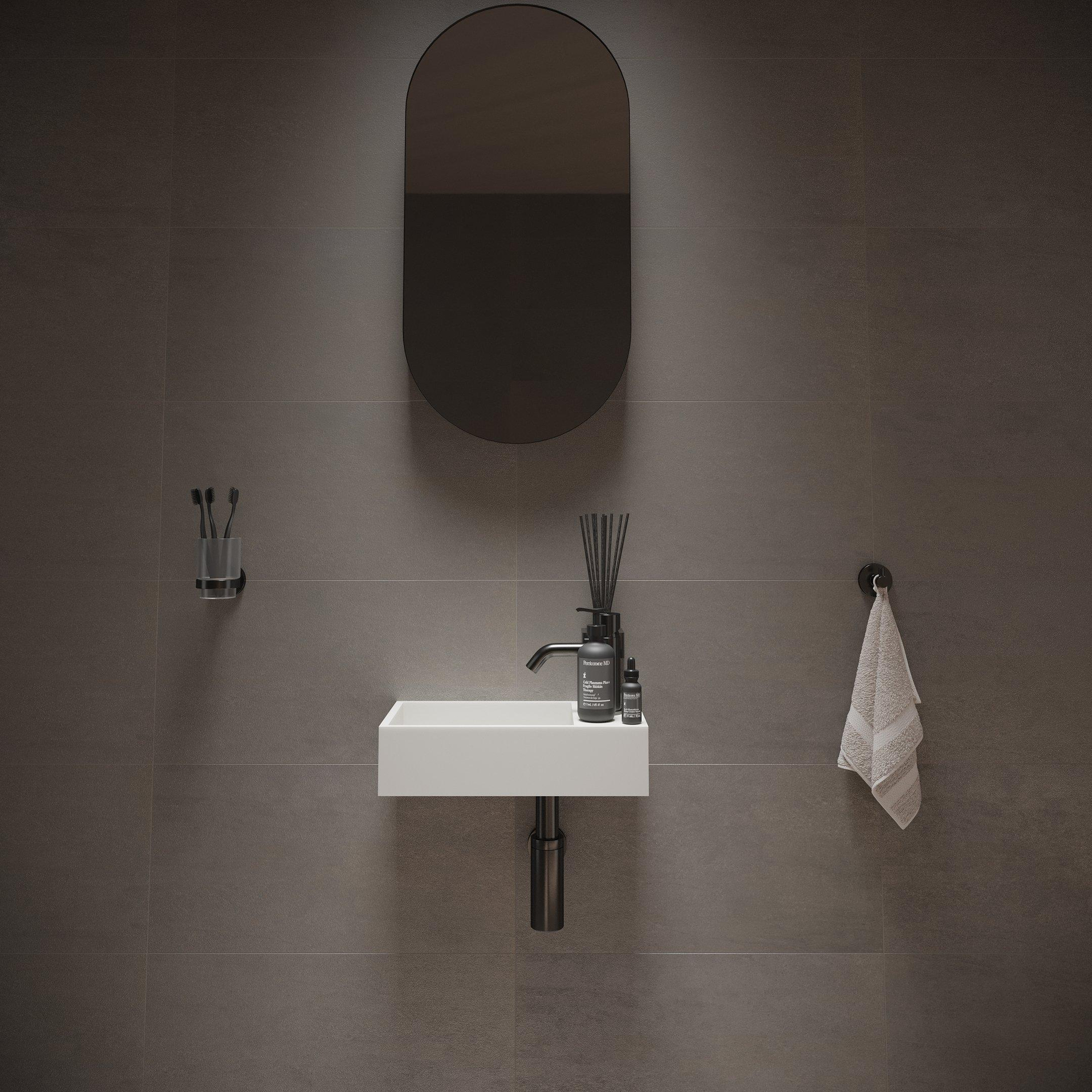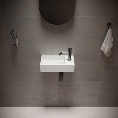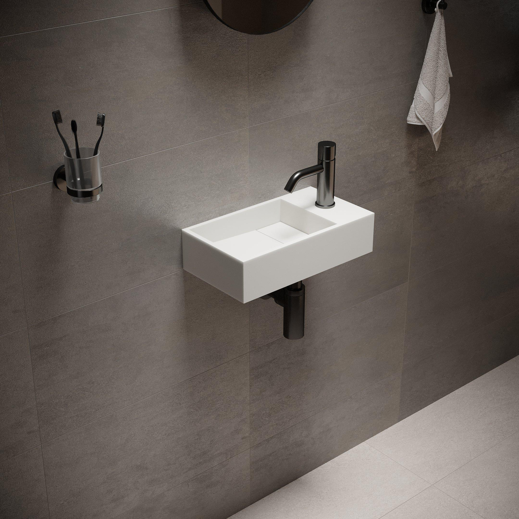Met een afmeting van 40x22x10 cm is deze fontein ontworpen voor compacte ruimtes, zonder dat het onhandig klein aanvoelt. De rechthoekige vorm sluit strak aan tegen de wand, waardoor je looppad zoveel mogelijk vrij blijft. De uit één stuk gevormde wasbak met subtiele afvoergleuf aan de bodem zorgt ervoor dat water netjes wegloopt, terwijl de randen slank en modern ogen. Dankzij het kraangat aan de rechterzijde kun je een compacte fonteinkraan plaatsen, zodat je voldoende wasruimte overhoudt. Omdat de fontein links én rechts te monteren is, bepaal je zelf de meest logische positie ten opzichte van de deur en het toilet, wat de gebruiksvriendelijkheid in een klein toilet merkbaar vergroot.