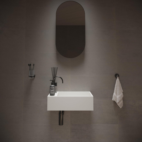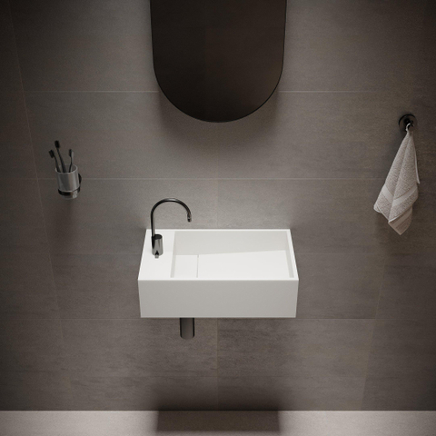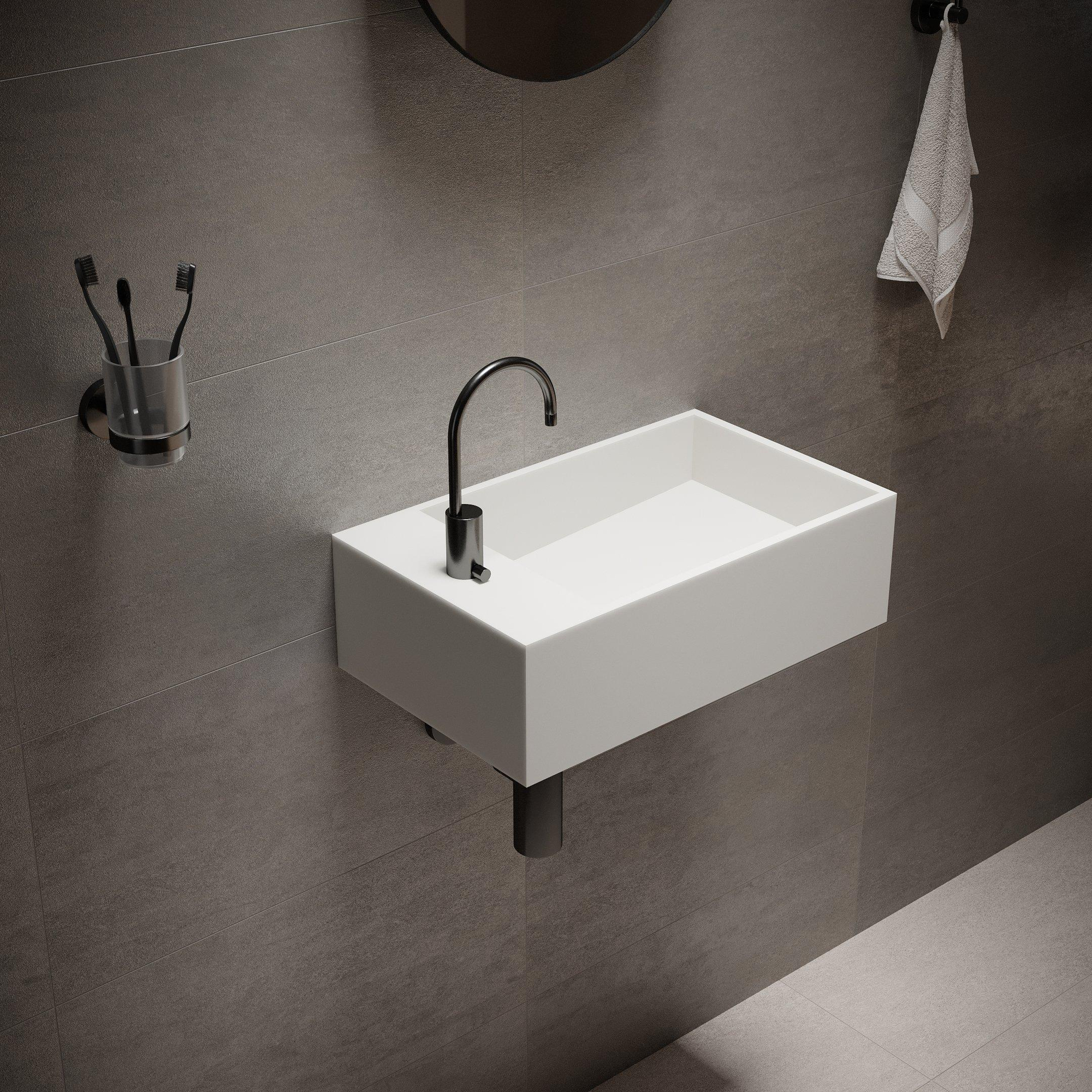 Met een afmeting van 50x30x15 cm is dit een slimme keuze voor toiletruimtes, nisjes of smalle badkamers waar de loopruimte beperkt is. De rechthoekige vorm sluit mooi aan tegen de muur en biedt toch voldoende diepte om comfortabel je handen te wassen. Doordat het kraangat aan de rechterzijde zit, blijft de wastafel zelf vrij ruim en gebruiksvriendelijk. De subtiele afvoergoot in de bodem houdt het geheel strak en minimalistisch, zonder losse onderdelen in het zicht. Zo creëer je een praktische handwasplek die niet domineert, maar mooi opgaat in de ruimte en zorgt voor een rustige, doordachte indeling.