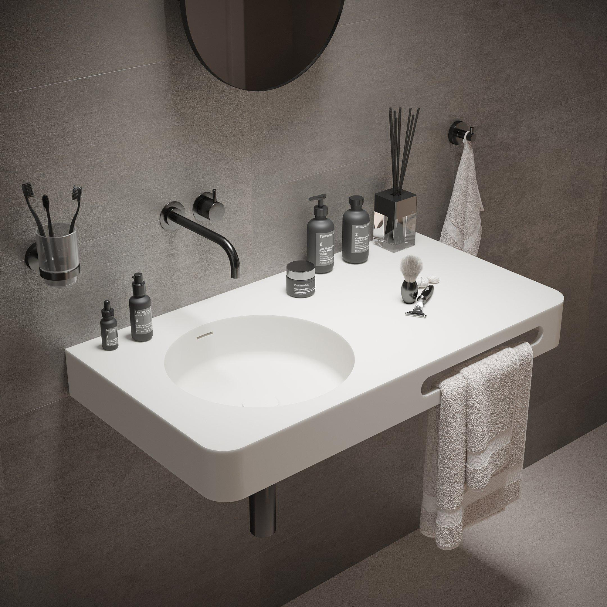 Met deze strakke, rechthoekige wastafel creëer je een luxe, hotelachtige uitstraling in je badkamer of toiletruimte. De combinatie van mat wit solid surface, een royale waskom en een geïntegreerde handdoekhouder maakt dit model ideaal voor moderne badkamers waarin design en gebruiksgemak hand in hand gaan. Dankzij de breedte van 90 cm is er genoeg ruimte om comfortabel je handen te wassen of je gezicht te verzorgen, zonder dat het geheel massief oogt. Het ontbreken van kraangaten geeft je bovendien alle vrijheid om te kiezen voor een mooie inbouw- of opbouwkraan, precies passend bij jouw stijl. Zo is dit een bijzonder geschikte keuze voor minimalistische interieurs, designliefhebbers en iedereen die graag een rustige, opgeruimde wastafelzone wil creëren.