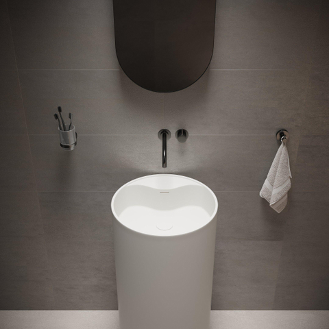 De ronde vorm zorgt direct voor een hotel-chique uitstraling en door de vrijstaande plaatsing krijgt je wastafel echt een centrale rol in de badkamer. Het mat witte oppervlak oogt rustig en hoogwaardig, zonder glans of drukte, waardoor je meer een interieurstuk dan een puur functioneel sanitairproduct in huis haalt. De slanke cilinder van 45 cm diameter neemt weinig vloeroppervlak in beslag, maar biedt dankzij de royale hoogte van 90 cm een comfortabele washoogte. Door te kiezen voor een wandkraan of staande wastafelkraan vlakbij, creëer je een minimalistische look met veel vrije ruimte rondom de kom, ideaal voor een luxe, open badkamersetting.