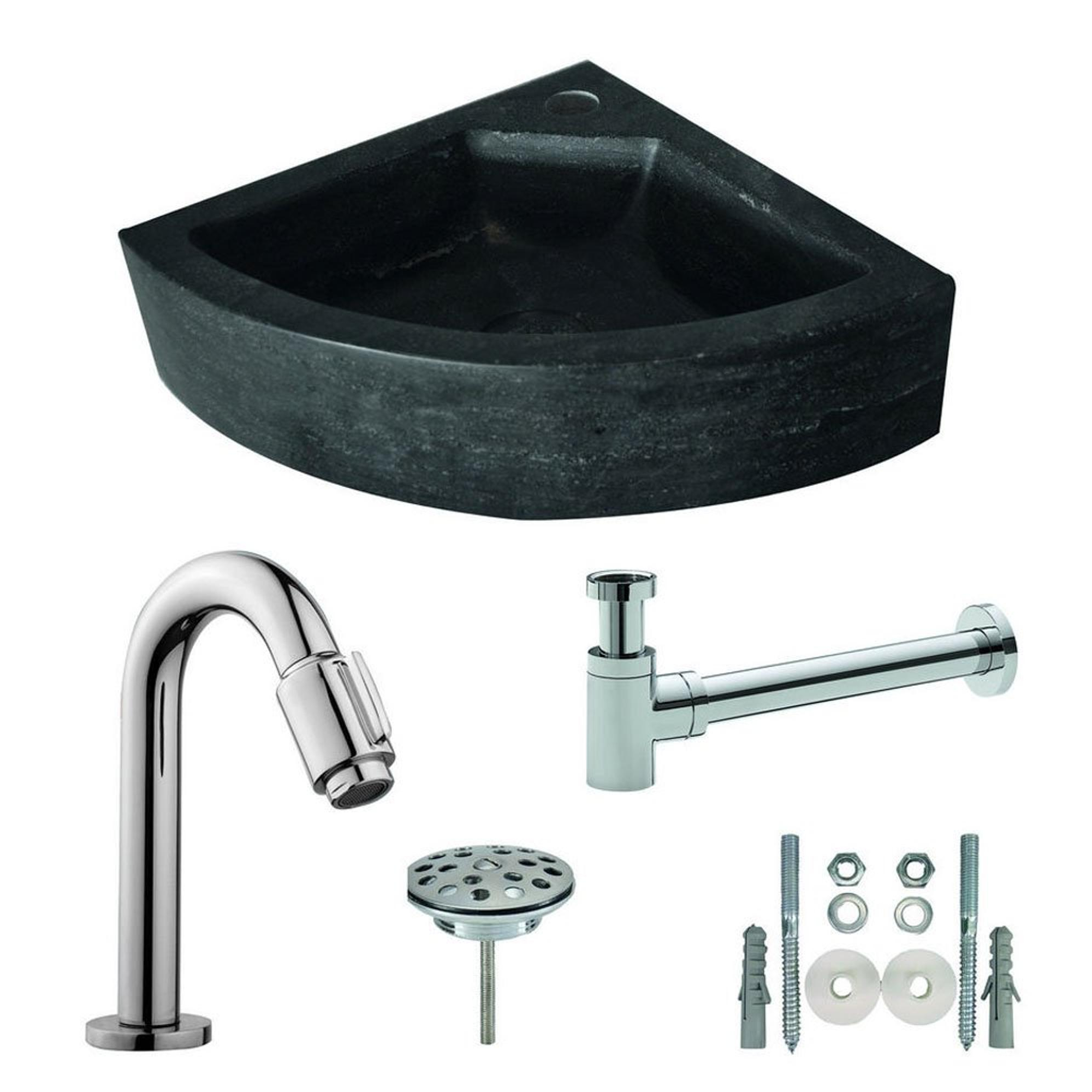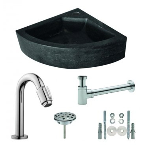 Deze hoekfontein wordt geleverd als een complete set inclusief alle benodigde onderdelen: de wastafel zelf, een Victoria toiletkraan in chroom, een chroom plug met rooster, een luxe kaag model sifon en een bevestigingsset. Dit betekent dat je alles in huis hebt om de fontein snel en vakkundig te monteren. Zo bespaar je tijd en voorkom je onnodige extra kosten of zoekwerk naar losse onderdelen.Kenmerken: