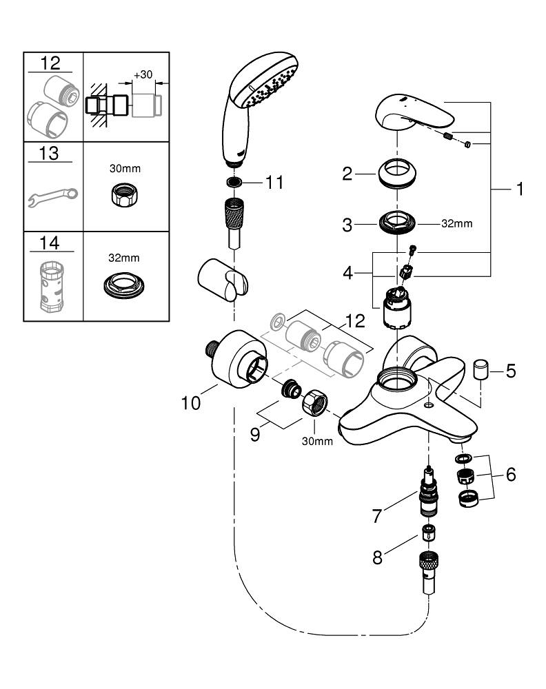 GROHE Eurostyle New badkraan met omstel met koppelingen met douchegarnituur met gesloten greep chroom/wit