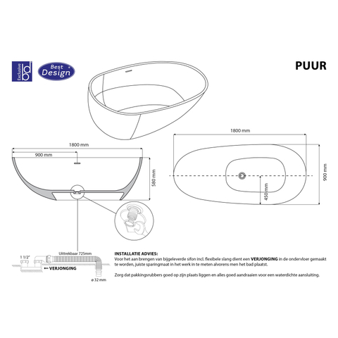 Met zijn afmetingen van 180x90x58cm biedt dit bad voldoende ruimte voor een comfortabele bade-ervaring. De strakke vormgeving en het solide materiaal maken dit bad niet alleen stijlvol, maar ook praktisch in gebruik. Voeg een vleugje klasse toe aan je badkamer met dit Best Design Puur vrijstaand bad.