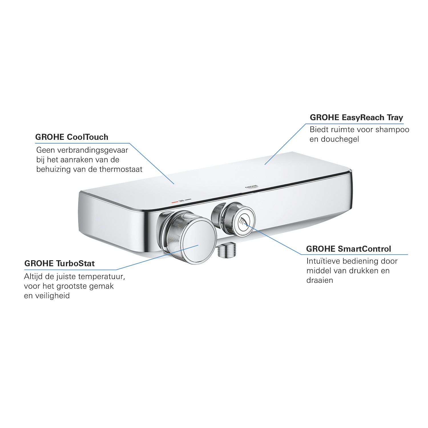 De slimme SmartControl-technologie maakt het bedienen van je douche eenvoudig en intuïtief. Met een druk op de knop start je de waterstroom, en door te draaien pas je het volume aan naar jouw wens. De geïntegreerde SafeStop-functie beschermt je tegen verbranding door een maximale temperatuur in te stellen, terwijl SafeStop Plus een extra limiet biedt voor nog meer veiligheid. De CoolTouch-behuizing voorkomt dat de kraan te heet wordt om aan te raken, wat vooral fijn is in huishoudens met kinderen. Daarnaast is er een handige EasyReach tray geïntegreerd, zodat je shampoo en doucheproducten altijd binnen handbereik hebt. Alles is ontworpen om jouw dagelijkse douchecomfort te verhogen.