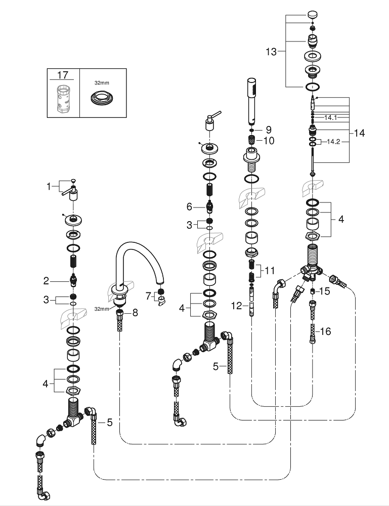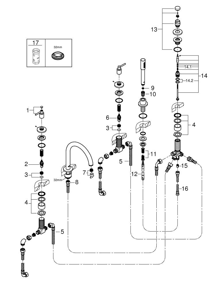 - Vijfgats badrandcombinatie met omstel voor baduitloop en handdouche