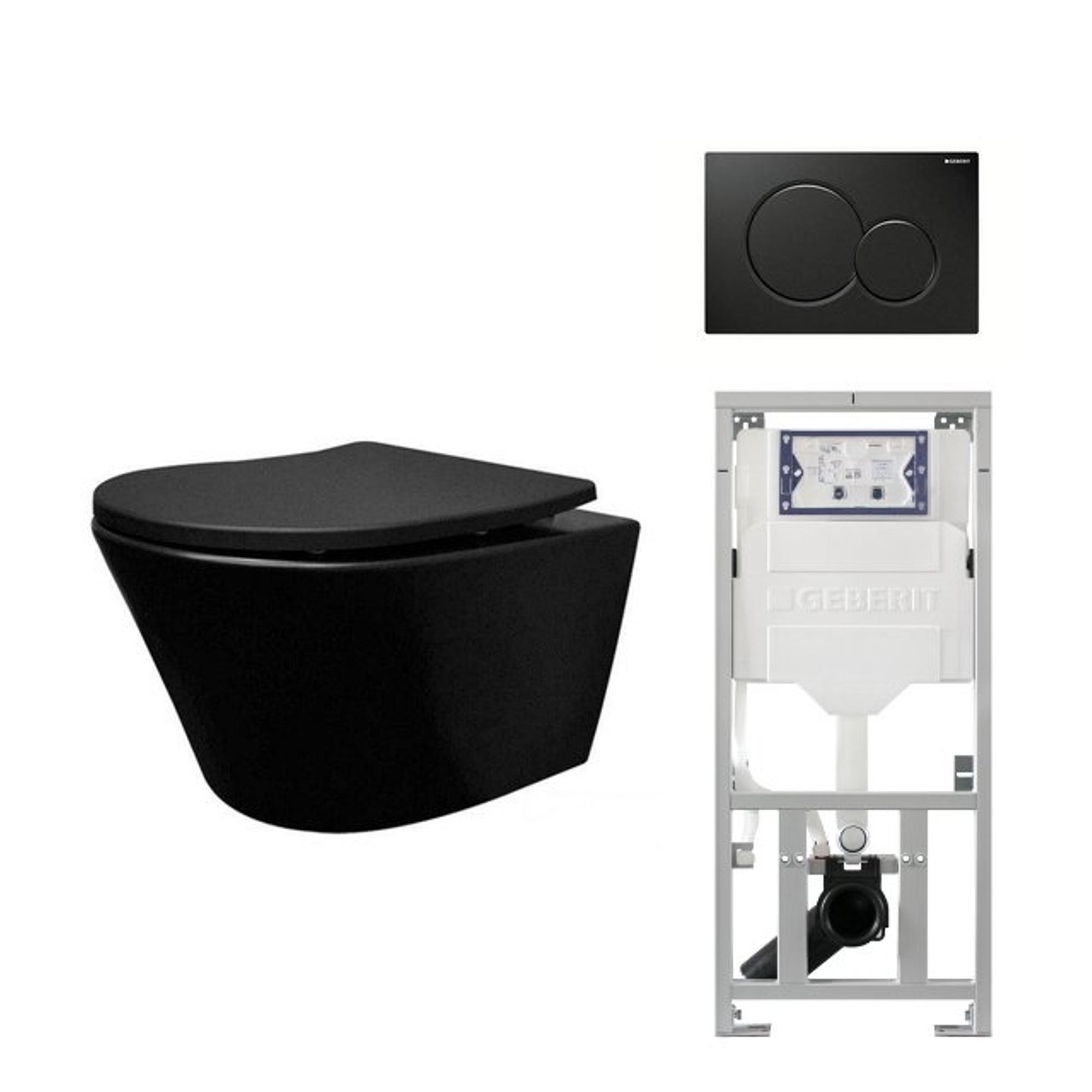 Wiesbaden Vesta toiletset Rimless 52cm mat zwart Geberit inbouwreservoir softclose en quickrelease toiletzitting met bedieningsplaat glans zwart
