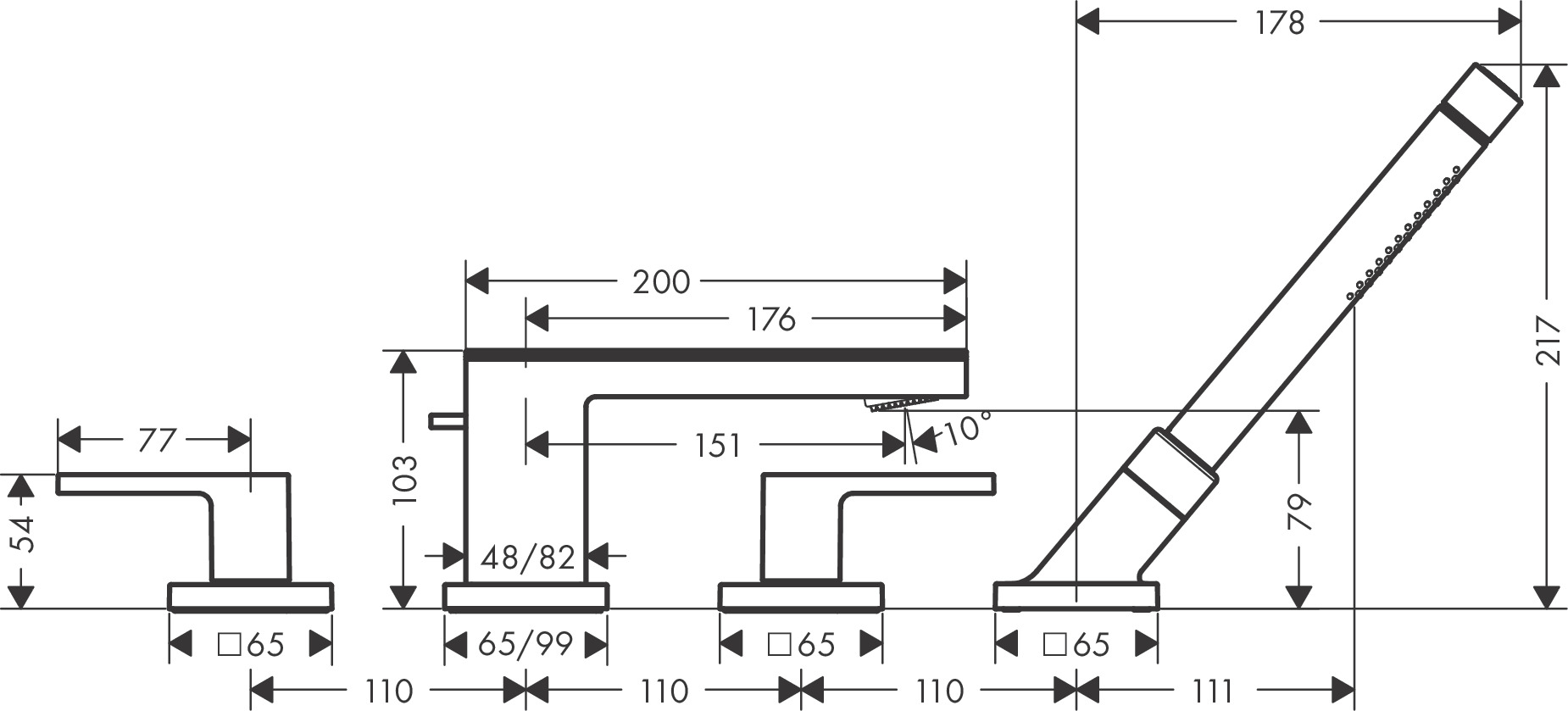 Hansgrohe AXOR MyEdition afbouwdeel 4-gats badrandkraan m. rechte greep met uitloop m. zwart glas voorsprong 15cm chroom