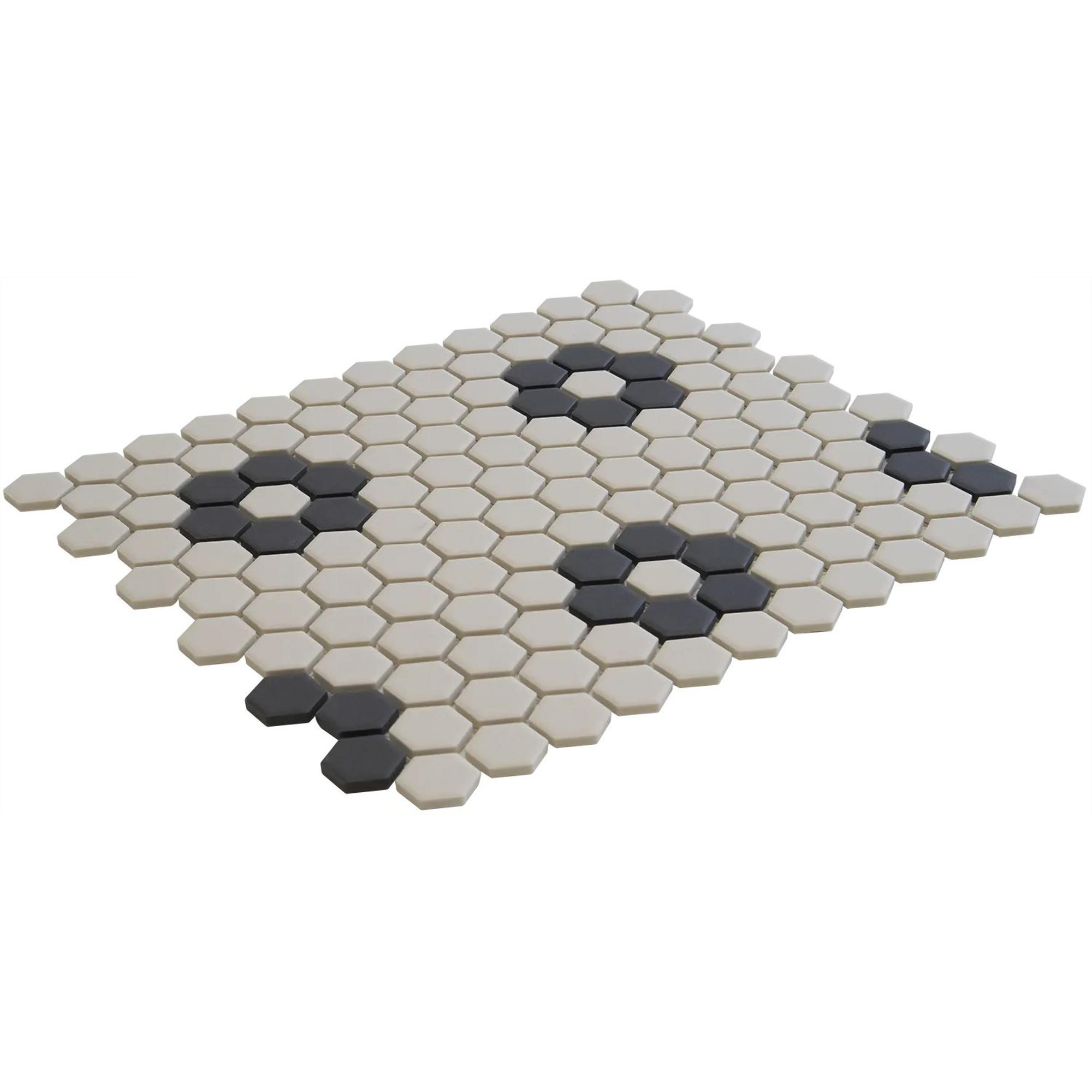 De Mosaic Factory London mozaïektegel straalt een onmiskenbare stijl uit. De combinatie van de zeshoekige vorm en het subtiele kleurenspel van wit en zwart mat porselein zorgt voor een tijdloze elegantie. Deze tegel is perfect voor het creëren van een chique en verfijnde uitstraling in badkamers, keukens of andere ruimtes in huis. Laat je inspireren door de stijlvolle uitstraling van deze unieke mozaïektegel.