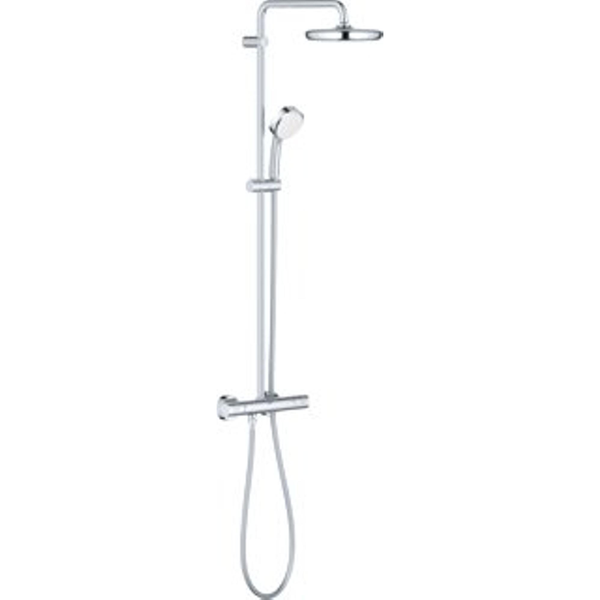 Met het GROHE Tempesta Cosmopolitan 210 douchesysteem met thermostaat voeg je meteen design en topprestaties toe aan je badkamer. Dit systeem zit ook vol met de geavanceerde technologie van GROHE. Stel je gewenste temperatuur in met GROHE TurboStat en het water blijft op temperatuur, ook als de watertoevoer schommelt. De eenvoudige SafeStop knop beperkt de temperatuur tot maximaal 38?C – ideaal als je kinderen alleen douchen – maar dit kan hoger gezet worden voor volwassenen. GROHE DreamSpray verdeelt het water gelijkmatig over ieder sproeigaatje – perfect voor de zachte Rain Spray van de New Tempesta 210 mm hoofddouche. De 390 mm douchearm van de hoofddouche draait zelfs 180º voor extra flexibiliteit. De New Tempesta Cosmopolitan 100 mm handdouche is voorzien van een 1750 mm Twistfree slang en twee straalsoorten die bij jouw stemming passen: een zachte Rain Spray en de revitaliserende Jet Spray. Met de Aquadimmer pas je met slechts één knop moeiteloos het volume van de waterstraal aan en schakel je eenvoudig tussen de hoofd- en handdouche. De handige siliconen SpeedClean sproeigaatjes kunnen eenvoudig vrij gehouden worden van vuil en kalk! De krasbestendige, glanzende GROHE StarLight chroomlaag gaat jarenlang mee en de InnerWater Guide voorkomt dat het oppervlak van de douche te heet wordt. Het GROHE Tempesta Cosmopolitan 210 douchesysteem – een perfecte douche tegen een onovertroffen prijs!