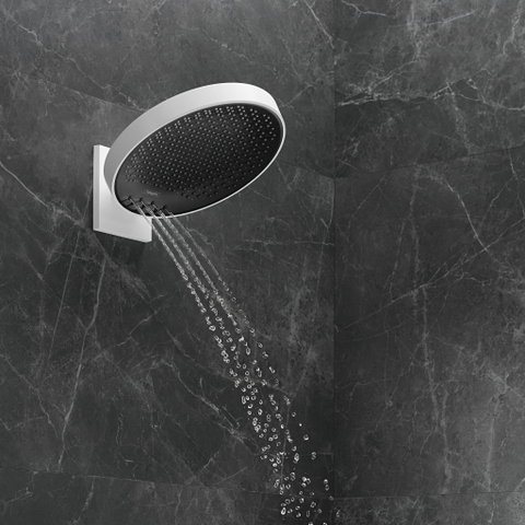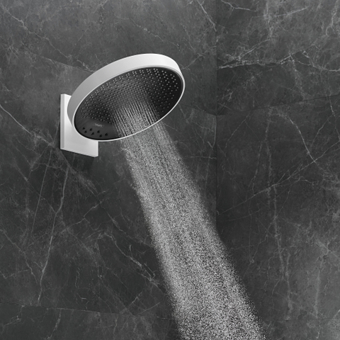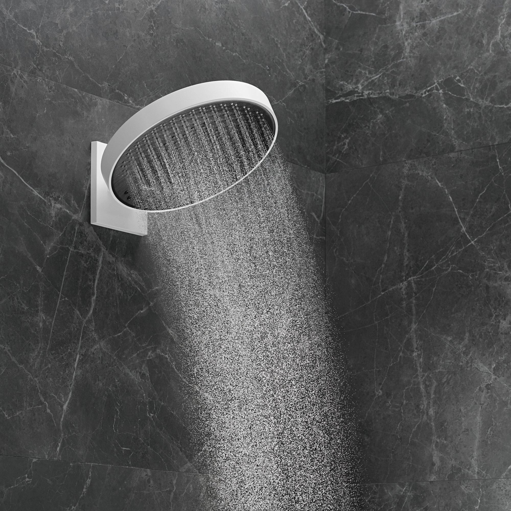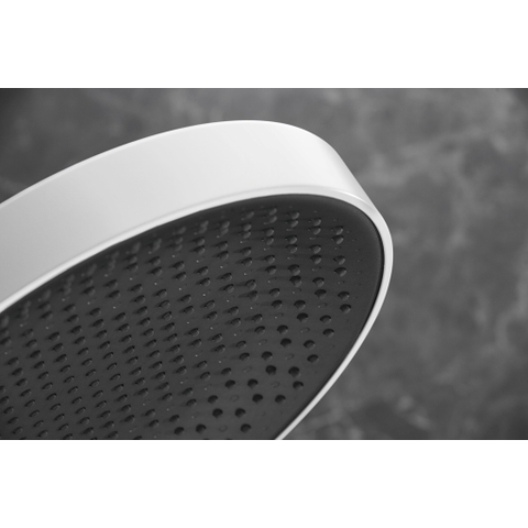 De uitstraling van deze hoofddouche is een perfecte balans tussen modern design en tijdloze elegantie. Het matwitte oppervlak straalt rust en verfijning uit, terwijl de antracietkleurige, licht naar binnen gebogen straalplaat van geanodiseerd aluminium een subtiel contrast biedt. Dit maakt de douchekop een echte eyecatcher die moeiteloos integreert in diverse badkamerstijlen. Dankzij de hoogwaardige afwerking behoudt het oppervlak zijn schoonheid, zelfs na jarenlang gebruik. Zo geniet je niet alleen van een prachtig design, maar ook van een duurzame investering die jouw badkamer een luxe uitstraling geeft.