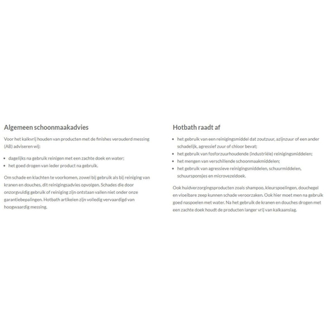 Om schade en klachten te voorkomen, zowel bij gebruik als bij reiniging van kranen en douches, dit reinigingsadvies opvolgen. Schades die door onzorgvuldig gebruik of reiniging zijn ontstaan vallen niet onder onze garantiebepalingen. Hotbath artikelen zijn volledig vervaardigd van hoogwaardig messing.