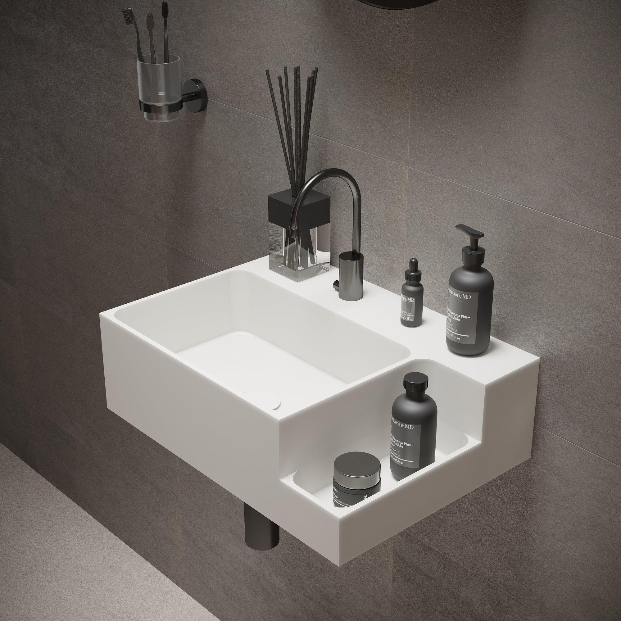 Het gebruik van solid surface geeft deze wastafel een hoogwaardig, naadloos en solide karakter. De mat witte afwerking oogt zacht en luxe, en laat zich eenvoudig combineren met zwarte, chromen of geborsteld metalen kranen en accessoires. Solid surface staat bekend om zijn strakke, egale oppervlak en moderne designuitstraling, waardoor deze wastafel perfect past in een hedendaagse designbadkamer of een stijlvol toilet. De kleur wit mat voorkomt harde reflecties en geeft juist een serene, rustige sfeer, wat vooral in kleinere ruimtes een groot verschil kan maken.