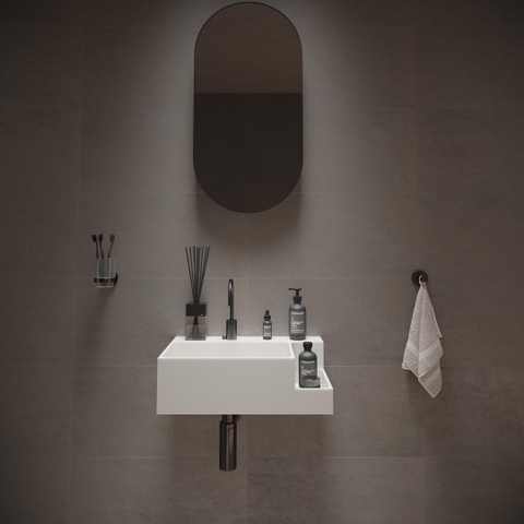 Met een breedte van 50 cm en een diepte van 36 cm benut je de beschikbare ruimte optimaal, zonder dat de wastafel massief oogt. De enkele wasbak is overzichtelijk en praktisch in gebruik, terwijl het smalle plateau aan de rechterzijde ruimte biedt voor een zeepdispenser, beker of andere dagelijkse benodigdheden. Dat maakt deze wastafel heel geschikt voor toiletruimtes of kleine badkamers waar elke centimeter telt. Het rechthoekige, strakke ontwerp zorgt voor een rustige lijn in de ruimte, wat extra ruimtelijk werkt. Zo combineer je functionaliteit met een verfijnde, moderne look.