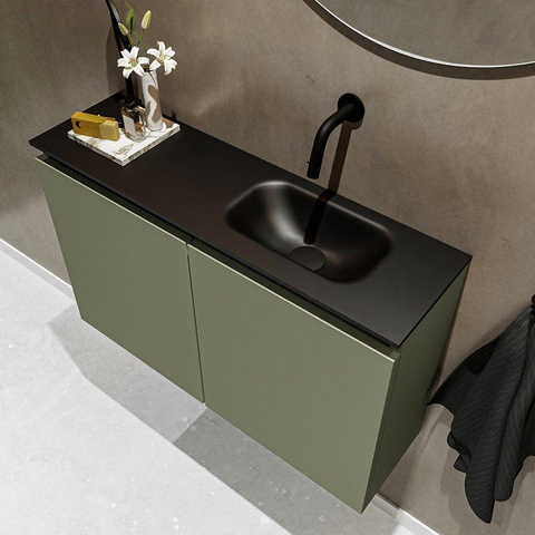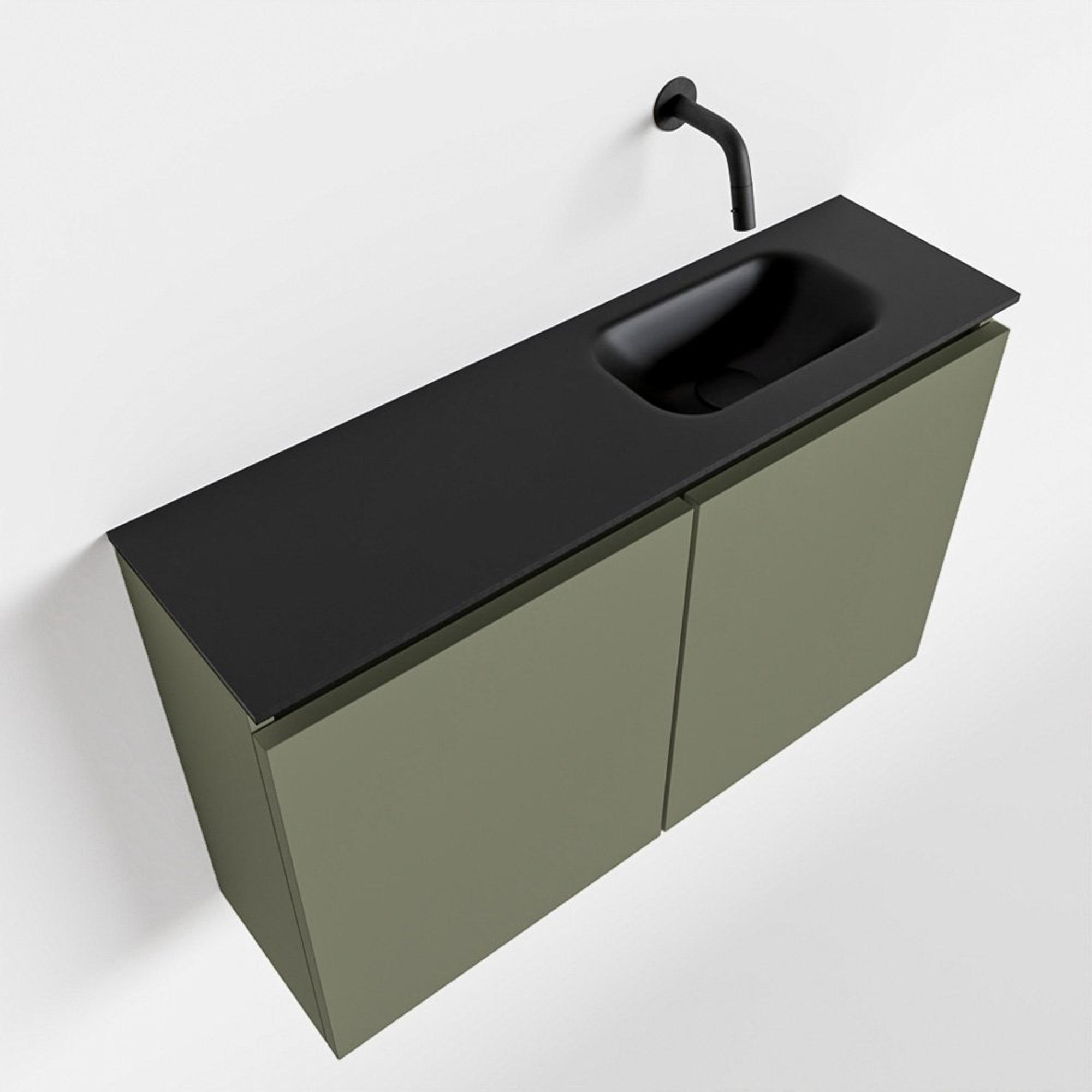 MONDIAZ TURE Fonteinset - 80x23x50cm - 0 kraangaten - 2 deuren - army mat - Wasbak rechts - Solid Surface Zwart