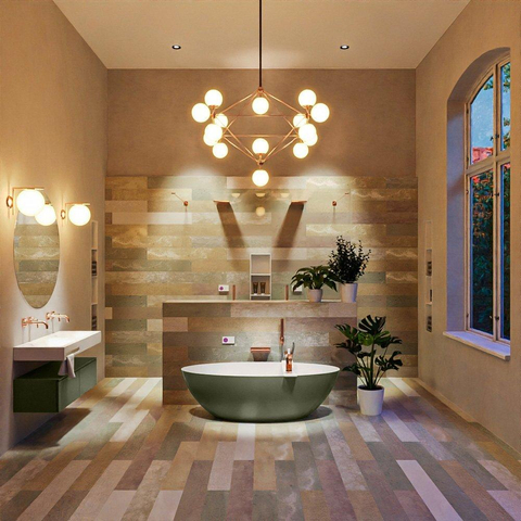 De ovale vorm kan goed vrijstaand geplaatst worden, maar zoals op de afbeelding staat het ook schitterend voor of bij een muur. Deze schitterende badkamer opstelling is gecombineerd met het badmeubel ALAN en Solid Surface nissen. Zowel de wastafel als de meubels kunnen perfect matchen met het bad. Je kunt met een gerust hart kiezen voor kleur in de badkamer.