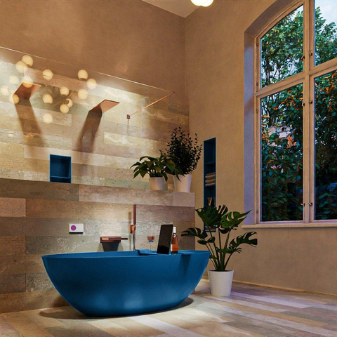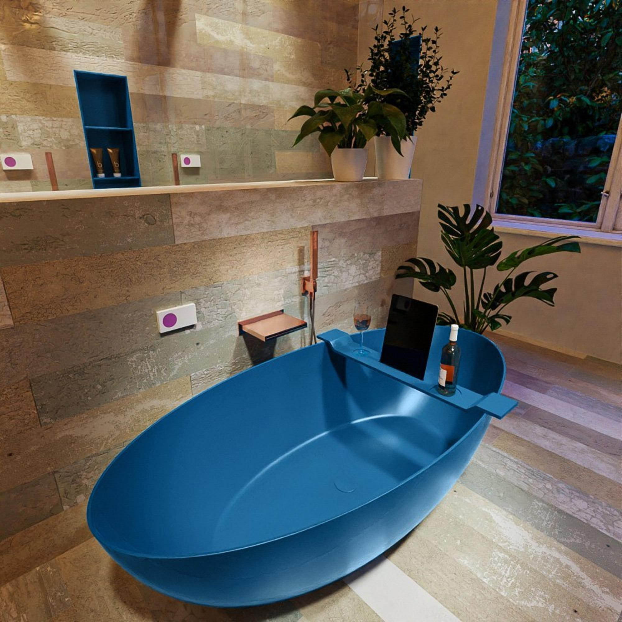 Met dit vrijstaande, ovale bad creëer je in één keer een echte designblikvanger in je badkamer. Het royale ligoppervlak van 170x80 cm biedt comfortabel ruimte om languit te ontspannen, terwijl de strakke vorm en matte blauwe kleur perfect passen in moderne, luxe of hotel-chique badkamers. Dankzij het solide materiaal voelt het bad warm en stevig aan, wat bijdraagt aan een ultiem wellnessmoment thuis. Dit model komt prachtig tot zijn recht in een ruime badkamer, midden in de ruimte of tegen een wand, en is een slimme keuze als je zoekt naar een combinatie van stijl, comfort en langdurige kwaliteit.