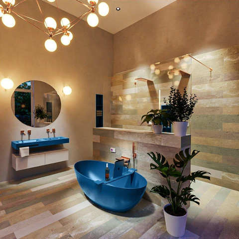 De matte jeanskleur geeft je badkamer direct karakter: eigentijds, gedurfd en toch tijdloos. De blauwe tint combineert prachtig met lichte tegels, naturel hout, zwarte accenten of juist warme aardetinten. Omdat binnen- en buitenzijde in dezelfde kleur zijn uitgevoerd, vormt het bad één rustig geheel in de ruimte. Zo kun je zonder aarzelen kleur toevoegen, zonder dat het druk oogt. Combineer het met een strak badmeubel of nissen in hetzelfde materiaal voor een harmonieus totaalbeeld, of laat het bad juist de hoofdrol spelen als losstaande blikvanger.