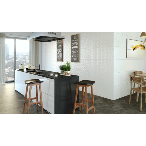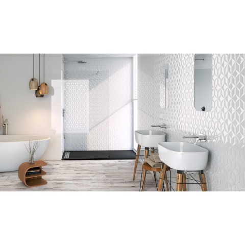 Het voelbare reliëf in de tegel geeft je badkamerwand diepte en karakter, zonder dat het te druk wordt. In combinatie met de matte, witte scherf ontstaat een zachte lichtweerkaatsing: daglicht en kunstlicht spelen met de structuur, waardoor de wand op elk moment van de dag nét anders oogt. Dit maakt de tegel ideaal als accentwand in de douche of achter het bad, maar ook prachtig in een compleet doorgetegelde ruimte als je een serene spa-uitstraling nastreeft. De decoruitvoering leent zich bovendien perfect om te combineren met rustige, effen wandtegels uit dezelfde serie.